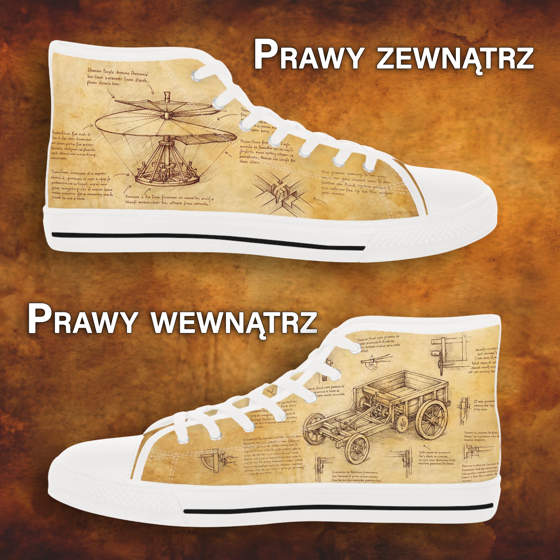 Wygląd jak z dawnego notesu wynalazcy, ale w formie wygodnych trampek na co dzień. Ciepłe, „postarzone” tło i sepiowe linie sprawiają, że styl jest subtelny z daleka i pełen detalu z bliska.