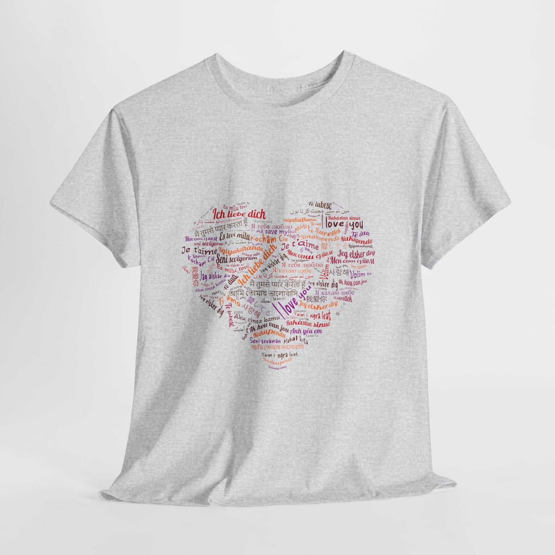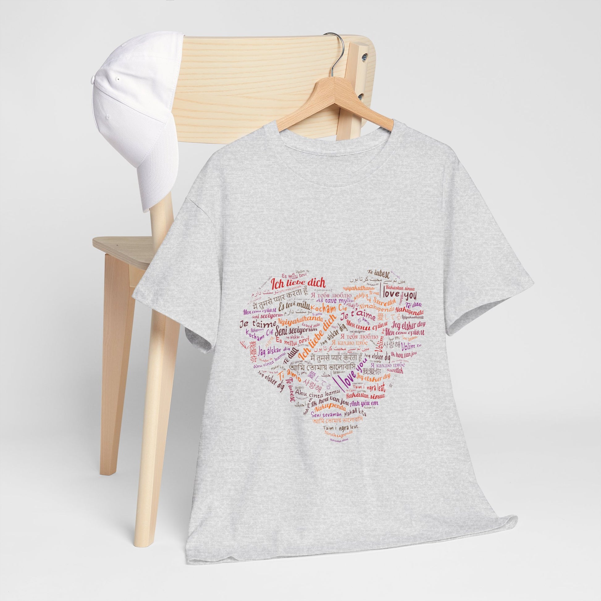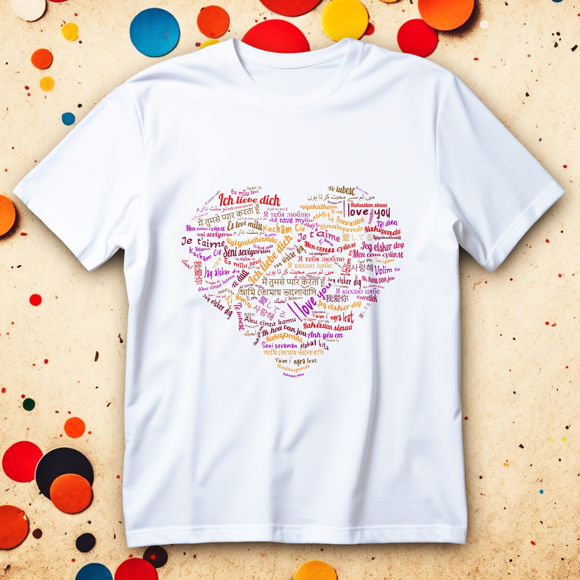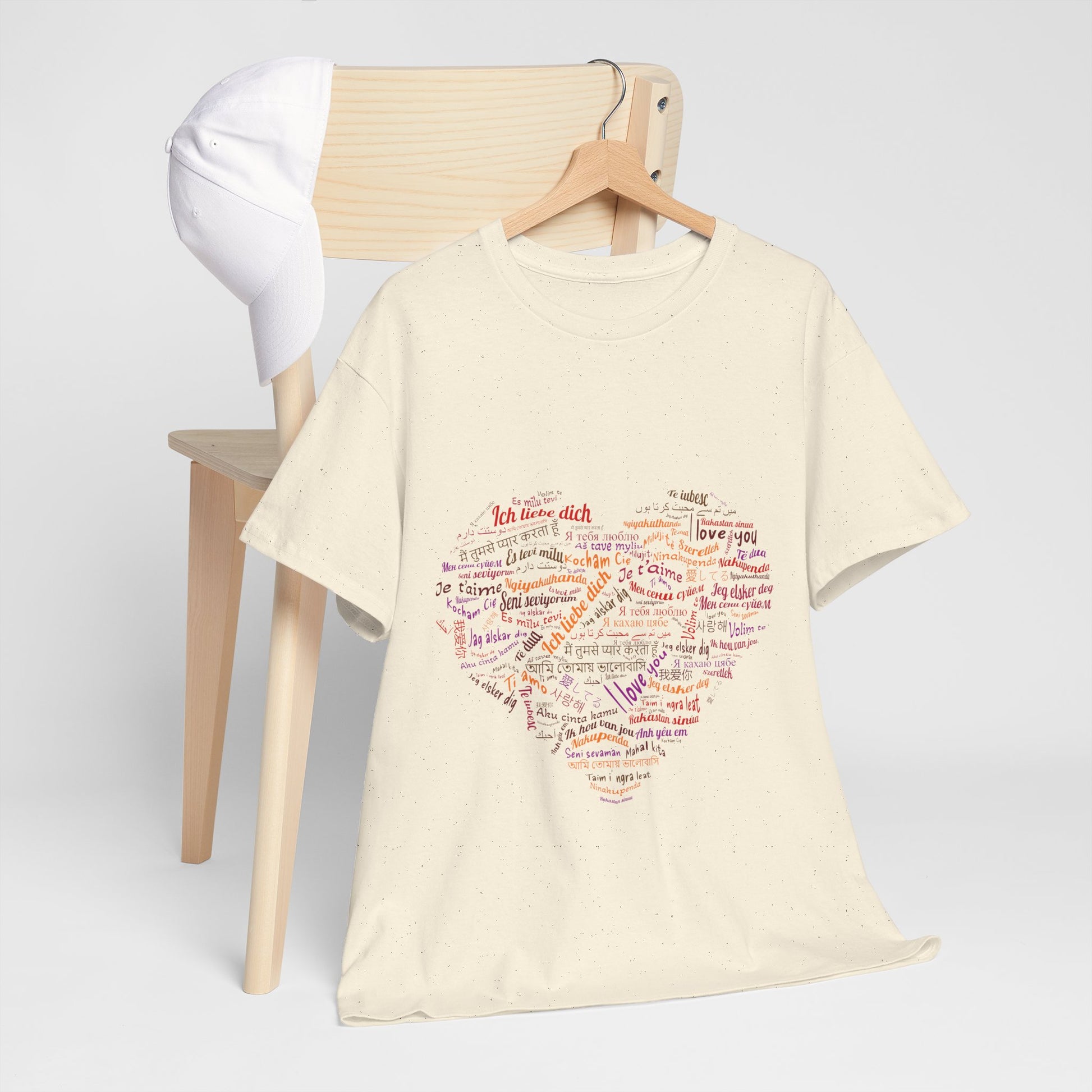 Bo zamiast jednego hasła masz całe serce złożone ze słów. Kolory i różne alfabety sprawiają, że nadruk wygląda żywo i przyciąga wzrok, ale nadal zostaje czytelny. To koszulka, która mówi „kocham” na sto sposobów, a i tak brzmi jak jedna wiadomość.