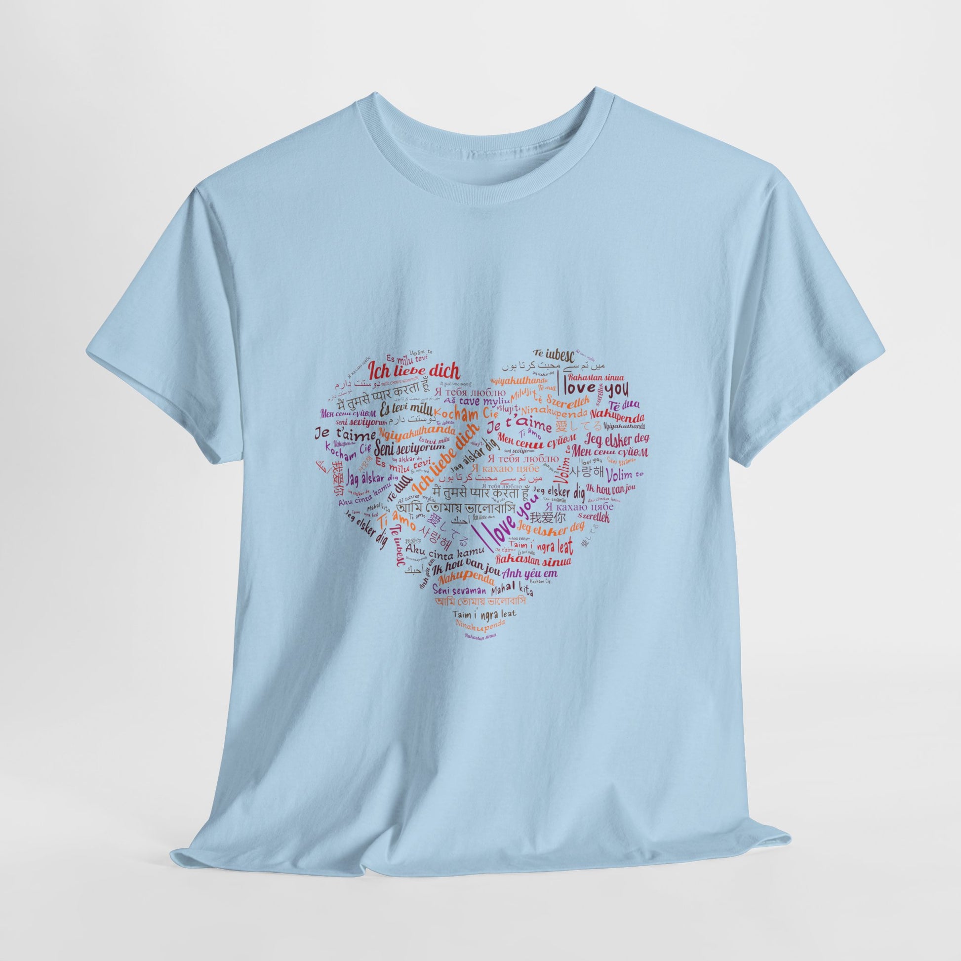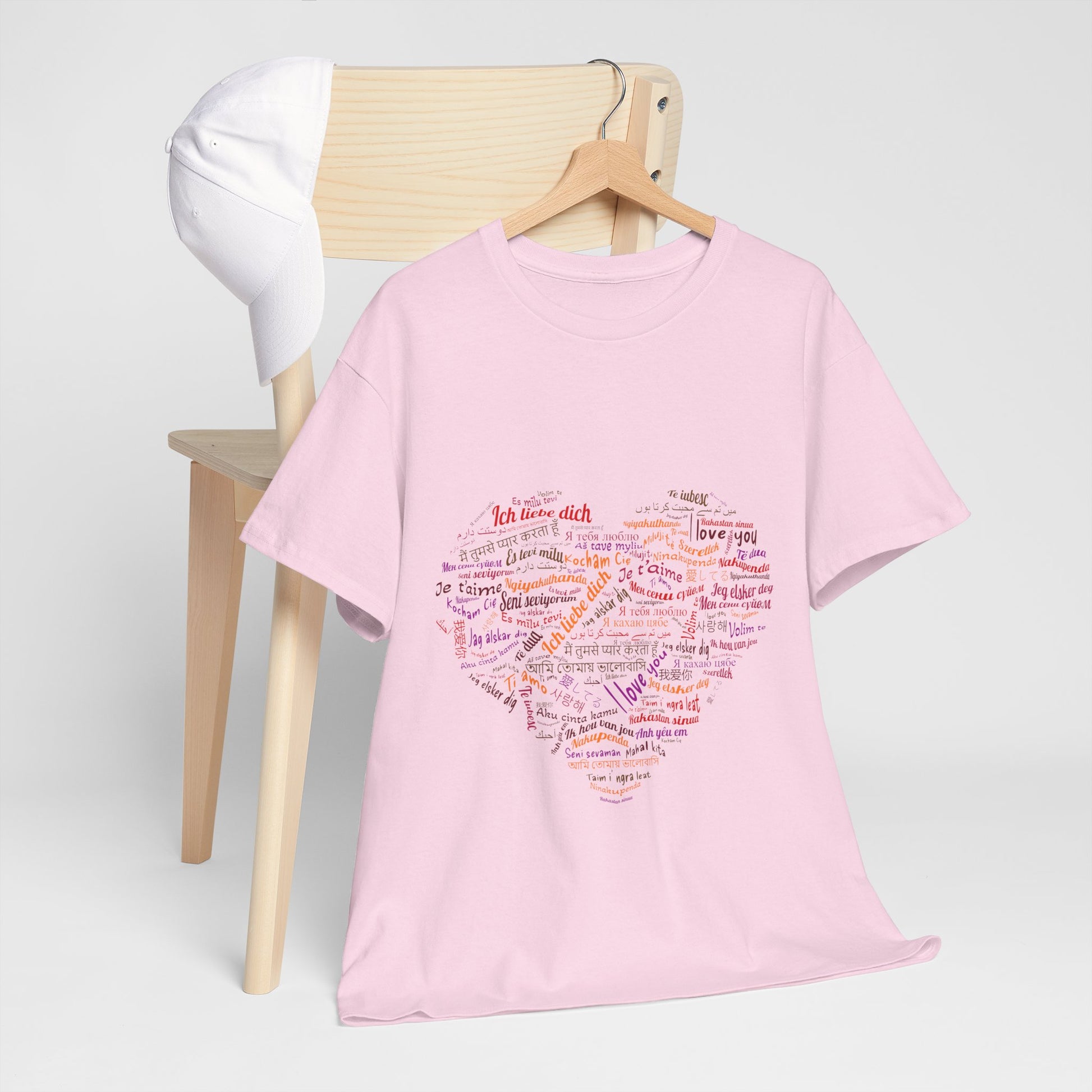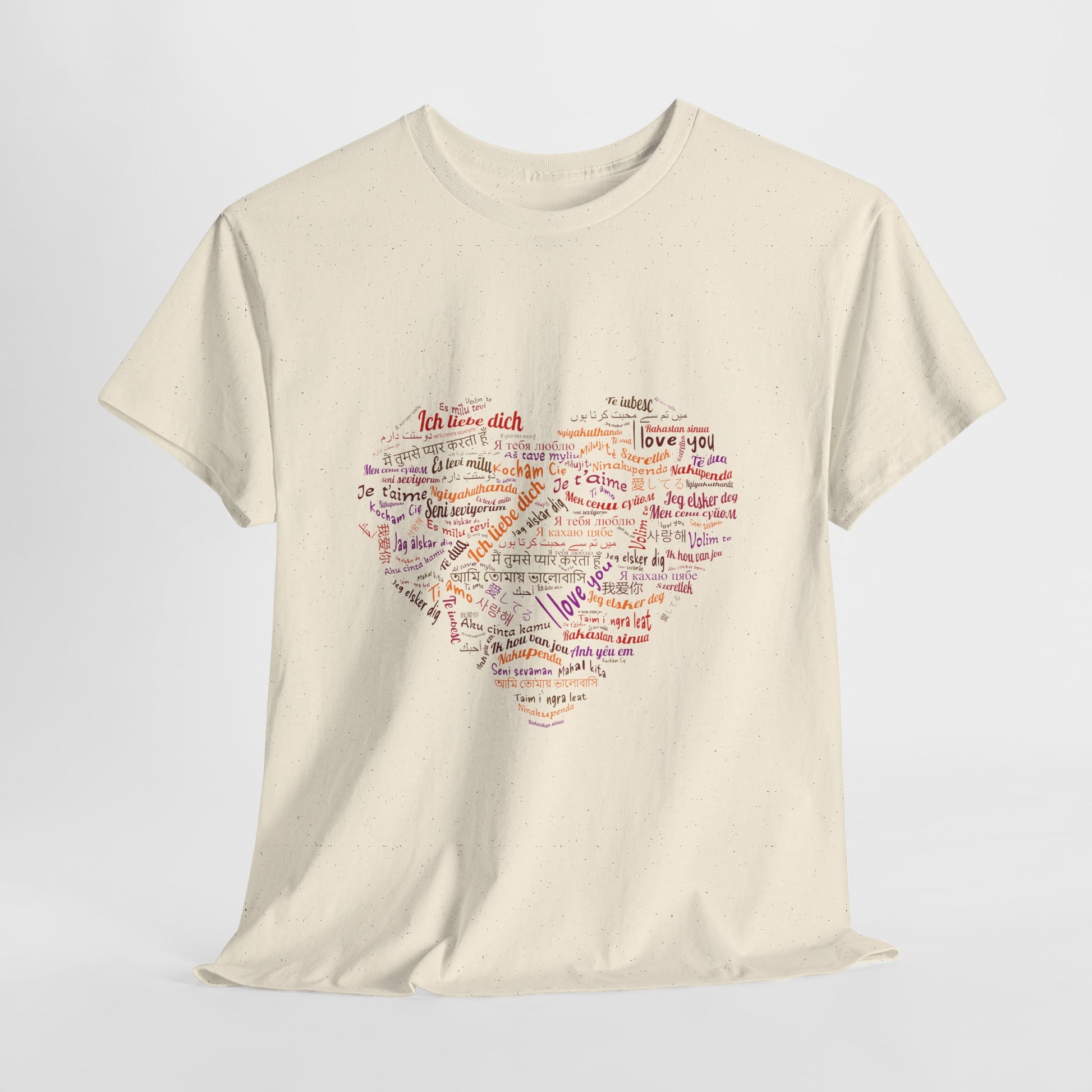 Bo zamiast jednego hasła masz całe serce złożone ze słów. Kolory i różne alfabety sprawiają, że nadruk wygląda żywo i przyciąga wzrok, ale nadal zostaje czytelny. To koszulka, która mówi „kocham” na sto sposobów, a i tak brzmi jak jedna wiadomość.