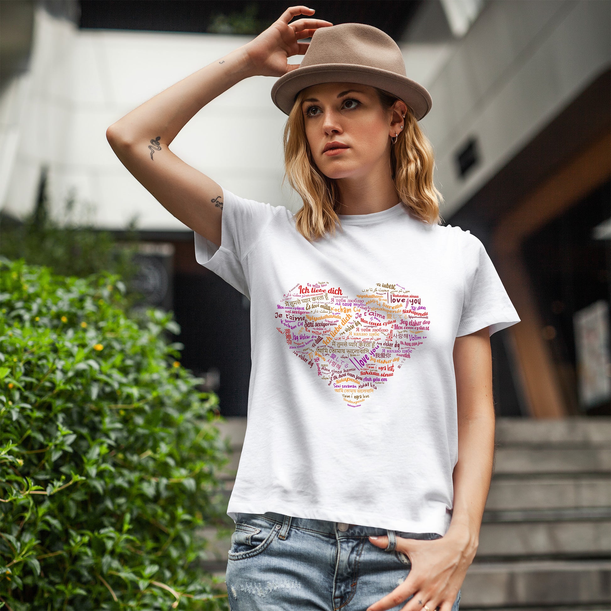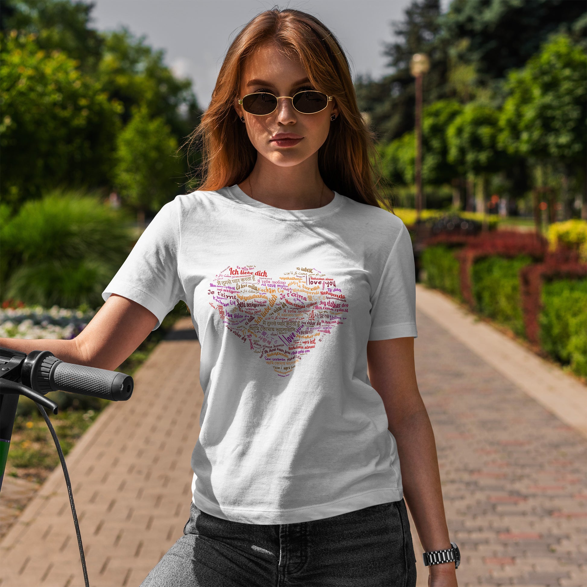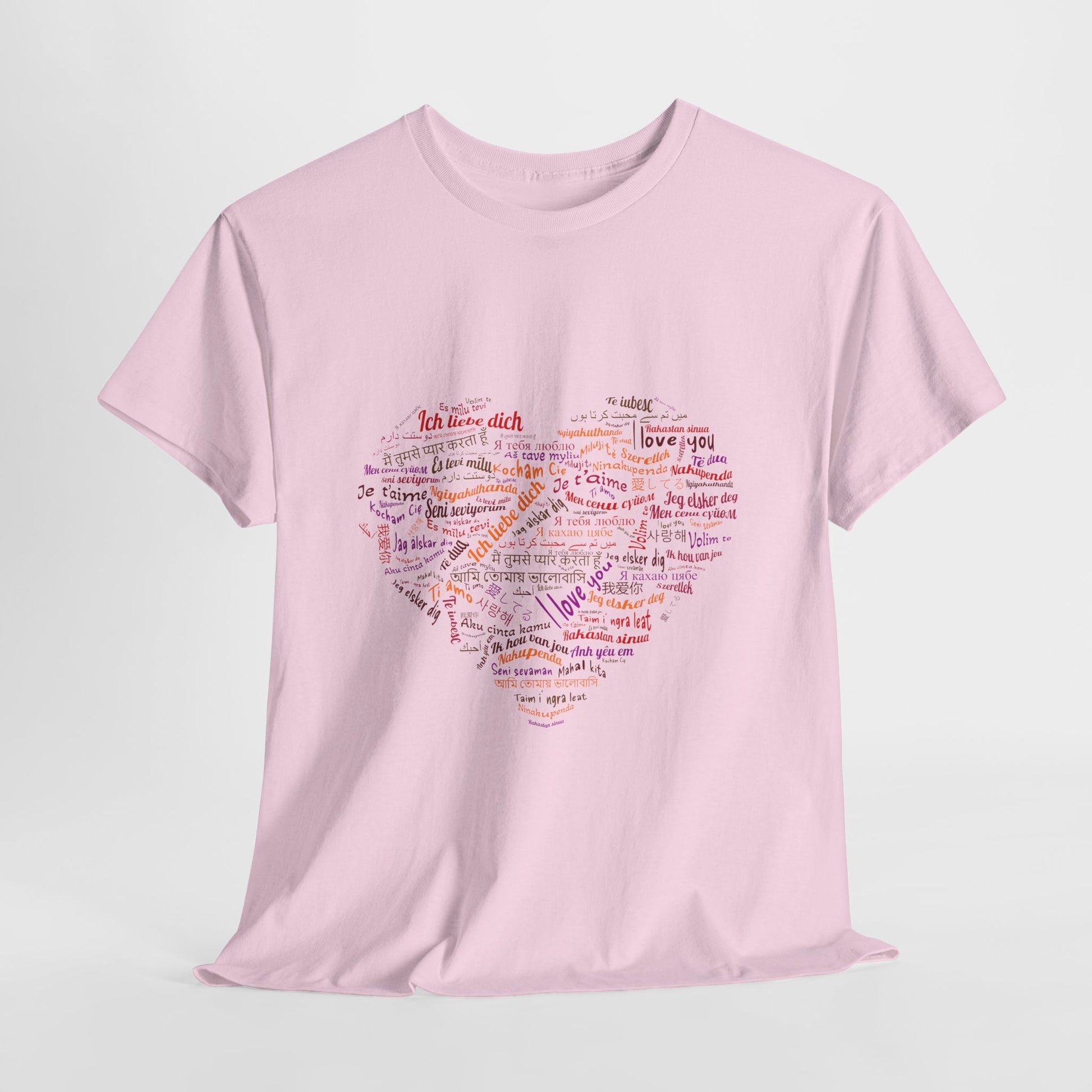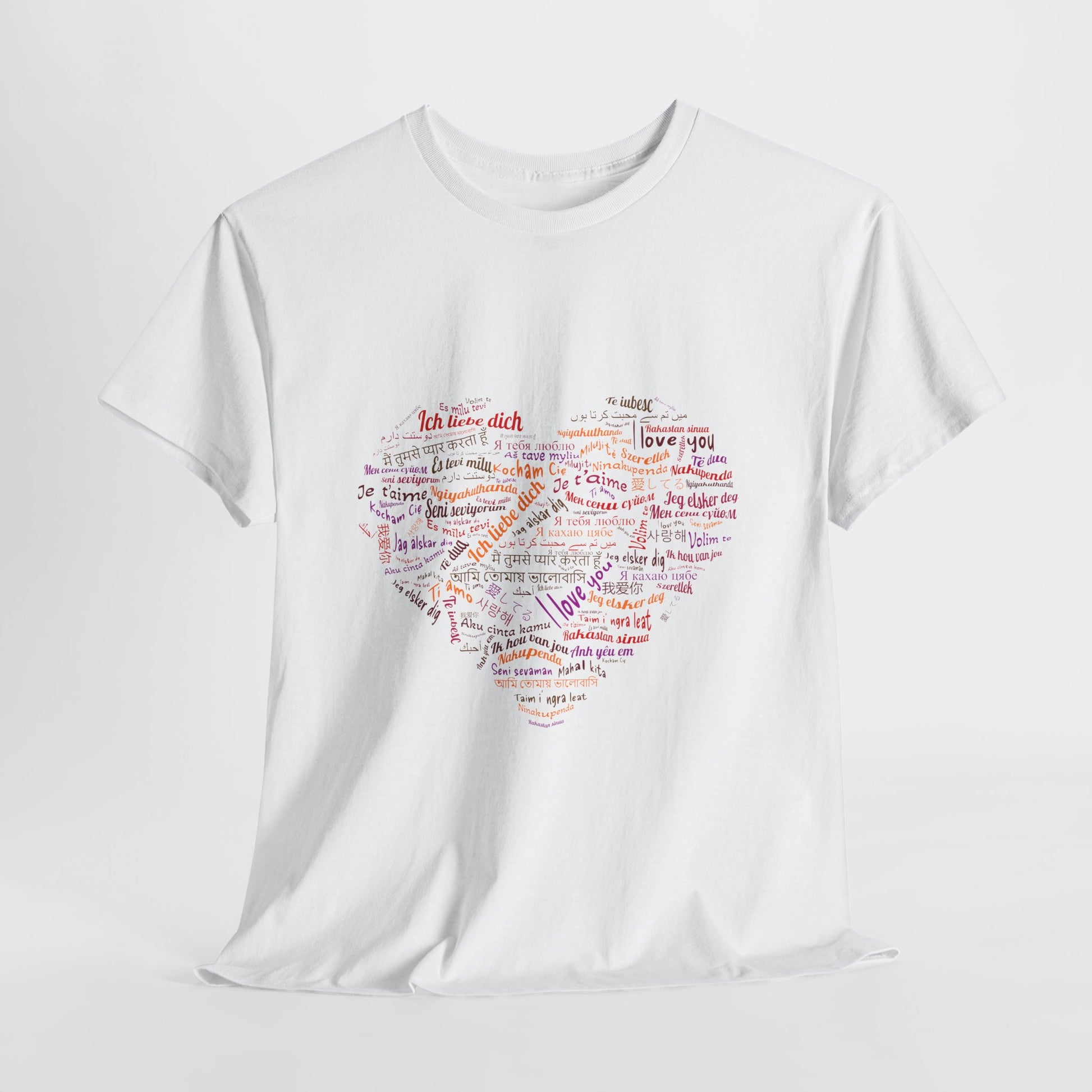 Bo zamiast jednego hasła masz całe serce złożone ze słów. Kolory i różne alfabety sprawiają, że nadruk wygląda żywo i przyciąga wzrok, ale nadal zostaje czytelny. To koszulka, która mówi „kocham” na sto sposobów, a i tak brzmi jak jedna wiadomość.