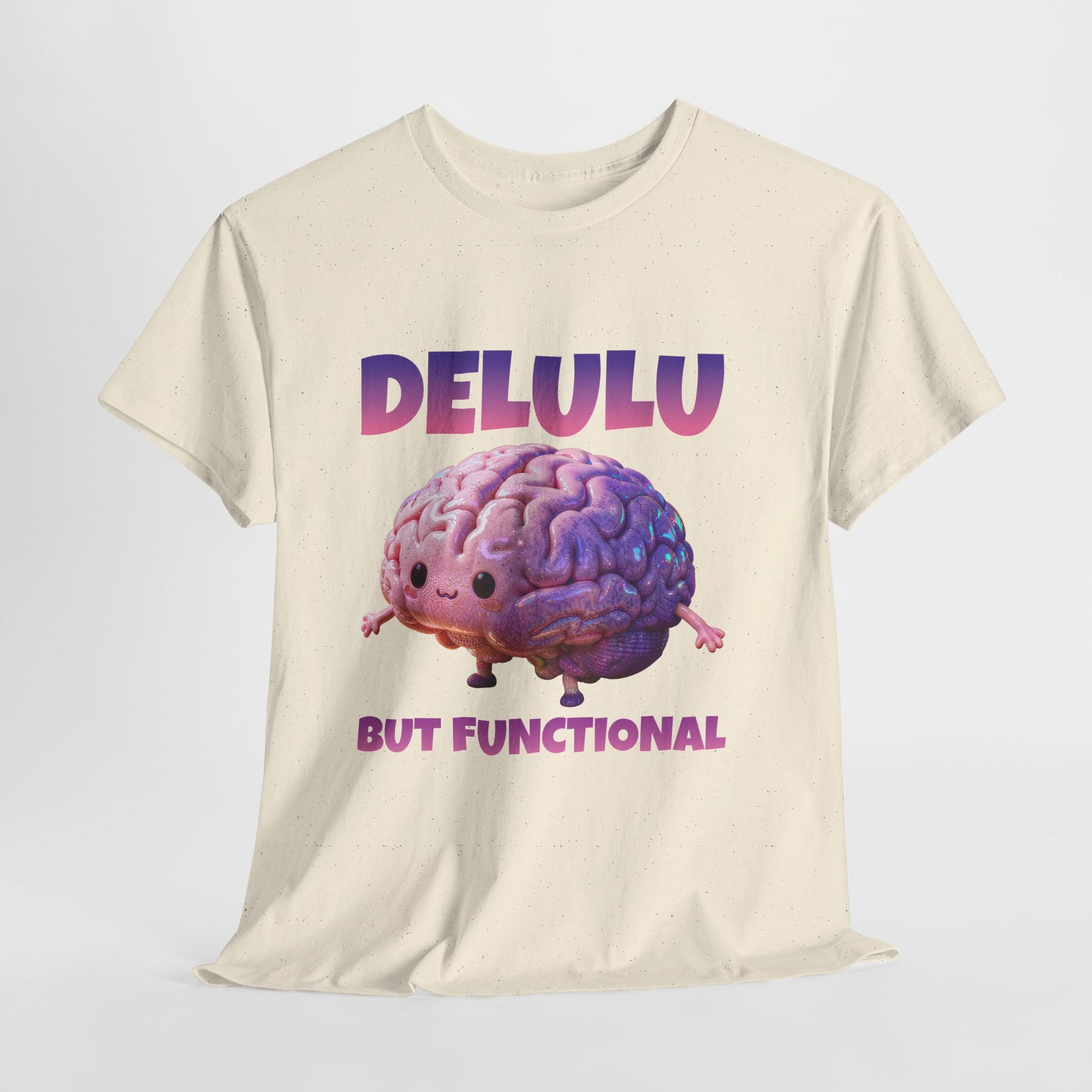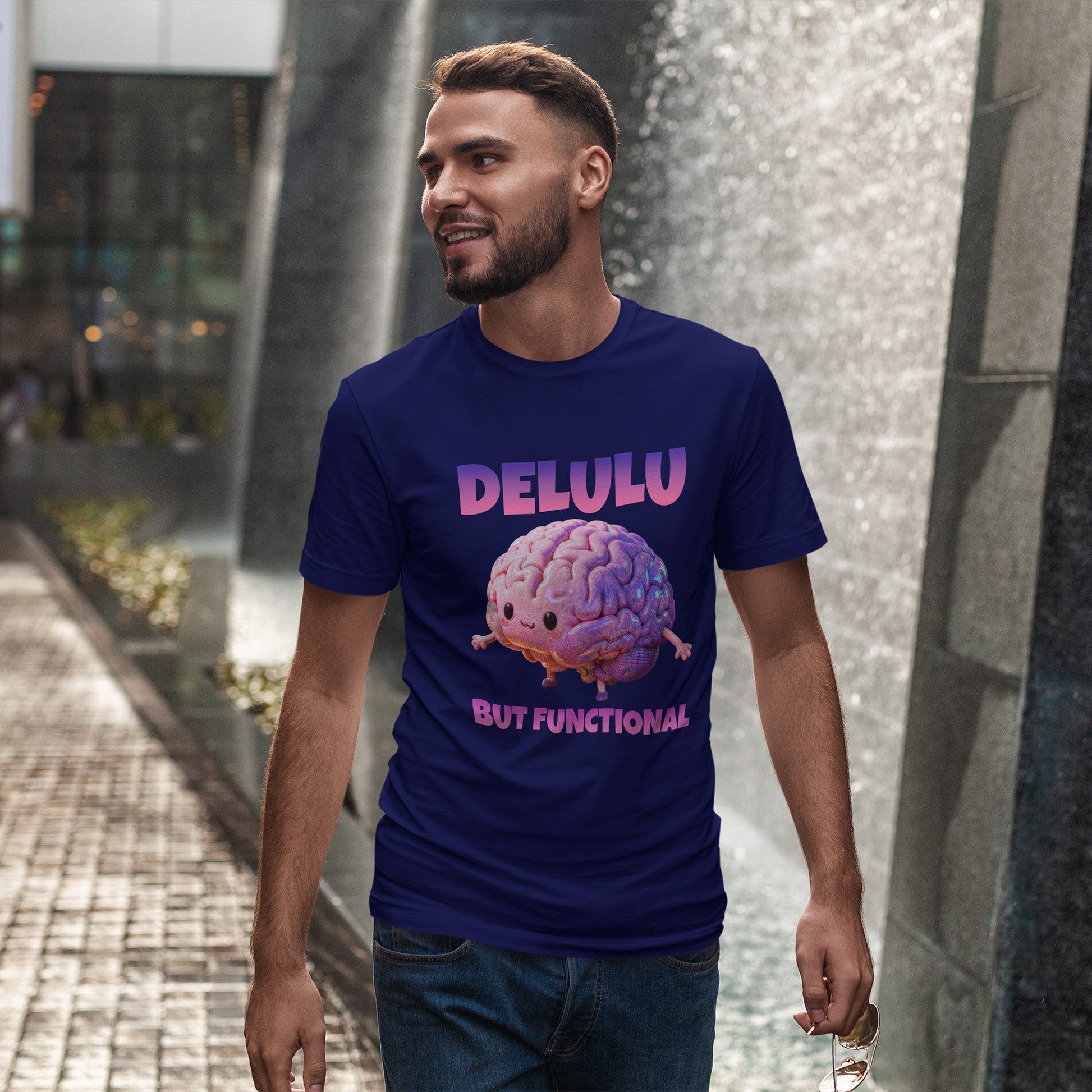 Na nadruku jest duży napis „DELULU” oraz „BUT FUNCTIONAL” i błyszczący, pastelowy mózg w różowo-fioletowych kolorach, z małymi rączkami i nóżkami. Całość jest w stylu cute-psychedelic: dużo połysku, miękkie gradienty i komiksowa forma, która przyciąga wzrok z daleka. Smaczek: „delulu” to internetowy skrót od „delusional” - używany żartobliwie, gdy ktoś ma odważny mindset i wielkie wizje, ale nadal potrafi je dowieźć. To koszulka, która robi uśmiech i jednocześnie mówi: mam swój świat, ale jestem funkcjonalna/funkcjonalny.