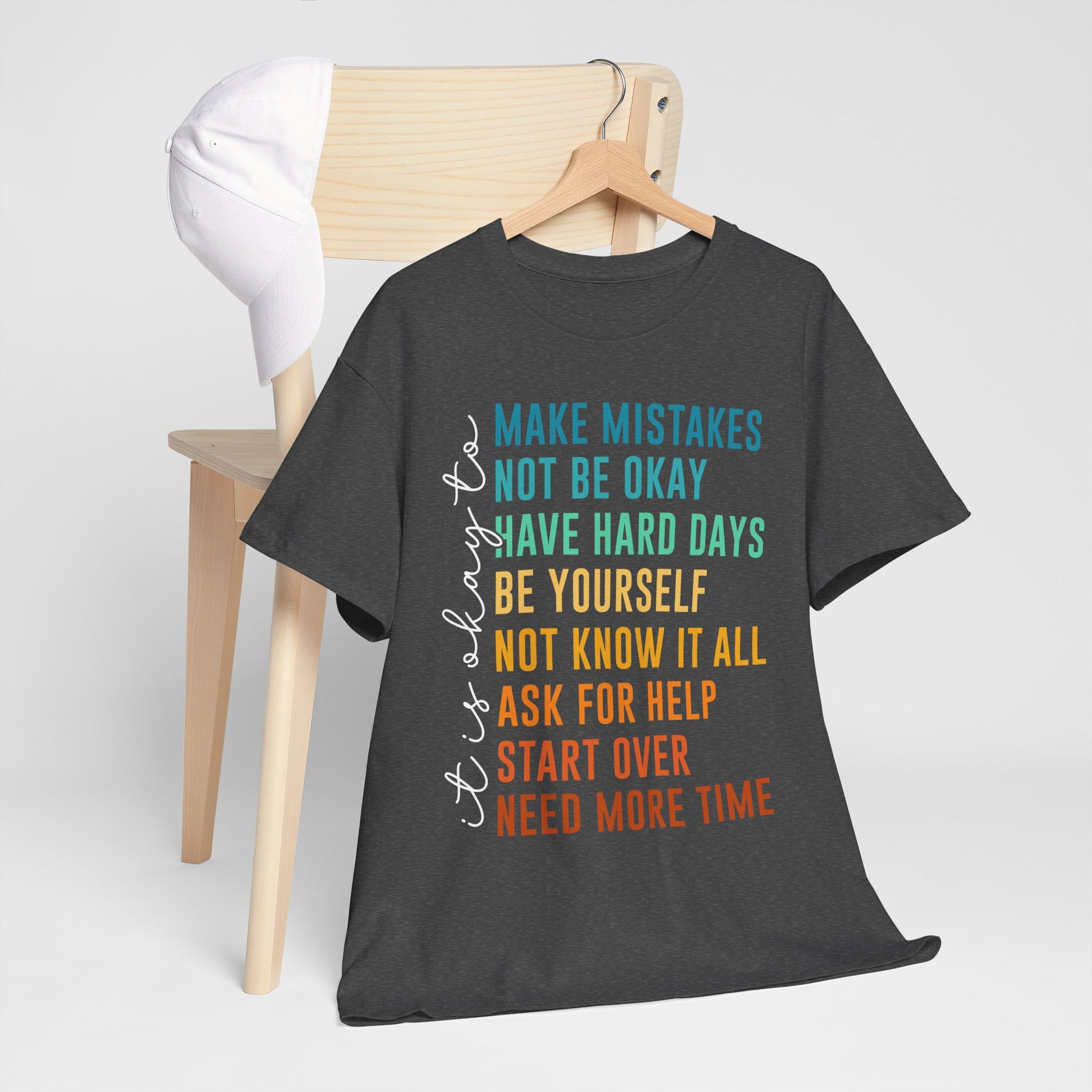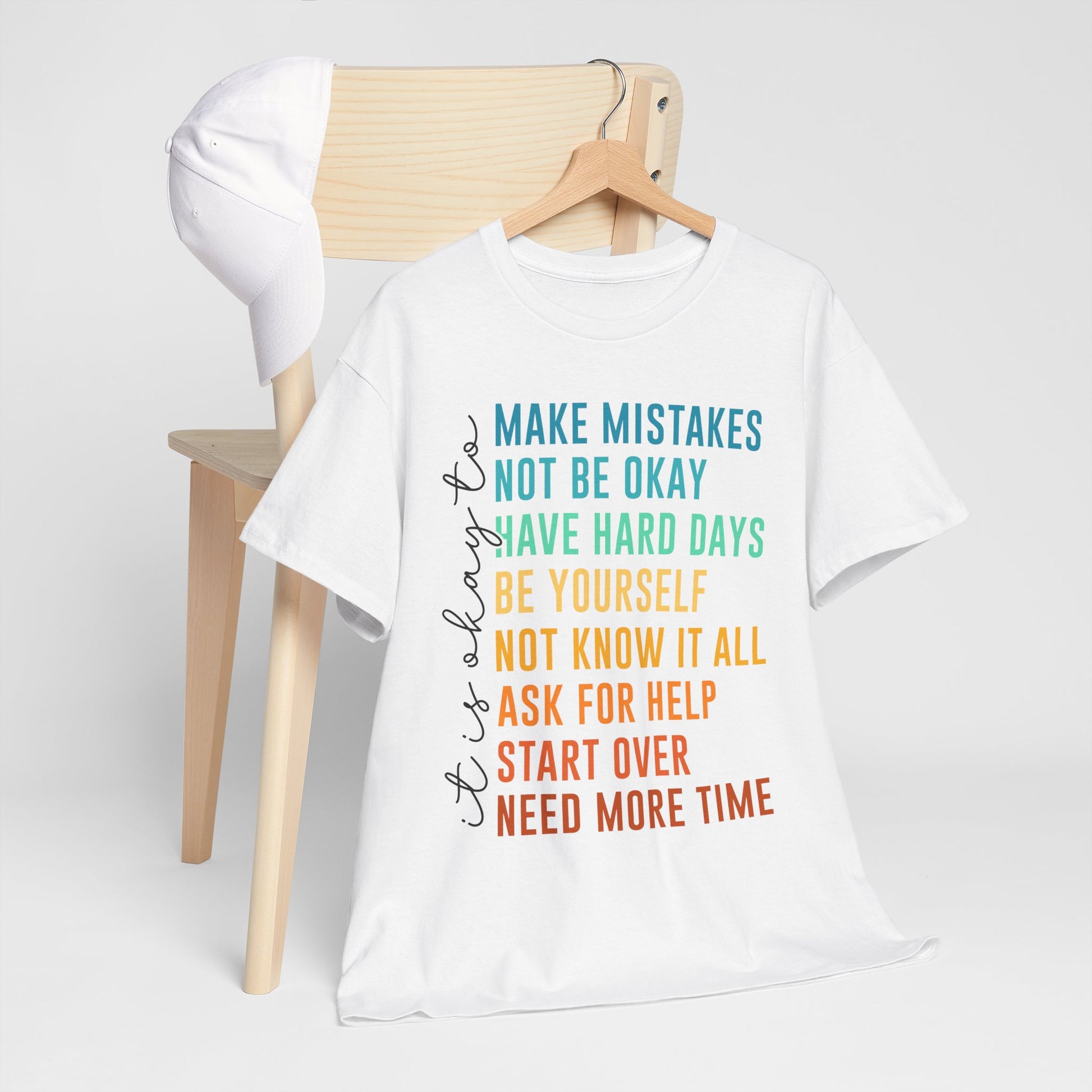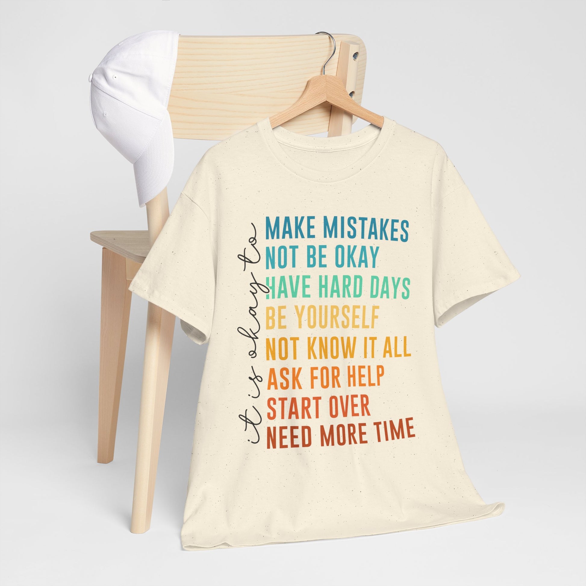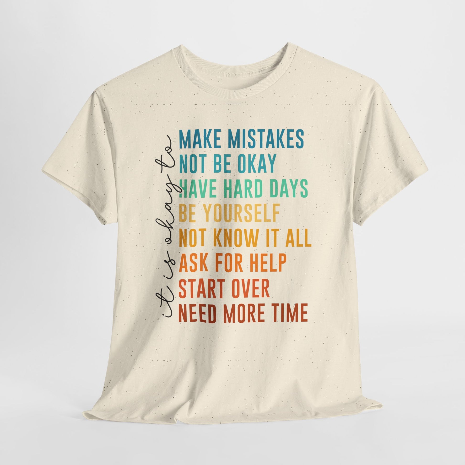 Na nadruku widnieje tekst „it’s okay to” oraz lista krótkich haseł w kolorowym gradiencie: „MAKE MISTAKES”, „NOT BE OKAY”, „HAVE HARD DAYS”, „BE YOURSELF”, „NOT KNOW IT ALL”, „ASK FOR HELP”, „START OVER”, „NEED MORE TIME”. Ten układ wygląda jak prosta mantra - bez kazania, za to z czułością. Smaczek: takie „pozwolenia” to często najlepszy reset - bo zamiast cisnąć, przypominają o człowieczeństwie. To idealny wybór na okres, gdy potrzebujesz wsparcia albo chcesz je dać komuś bliskiemu.