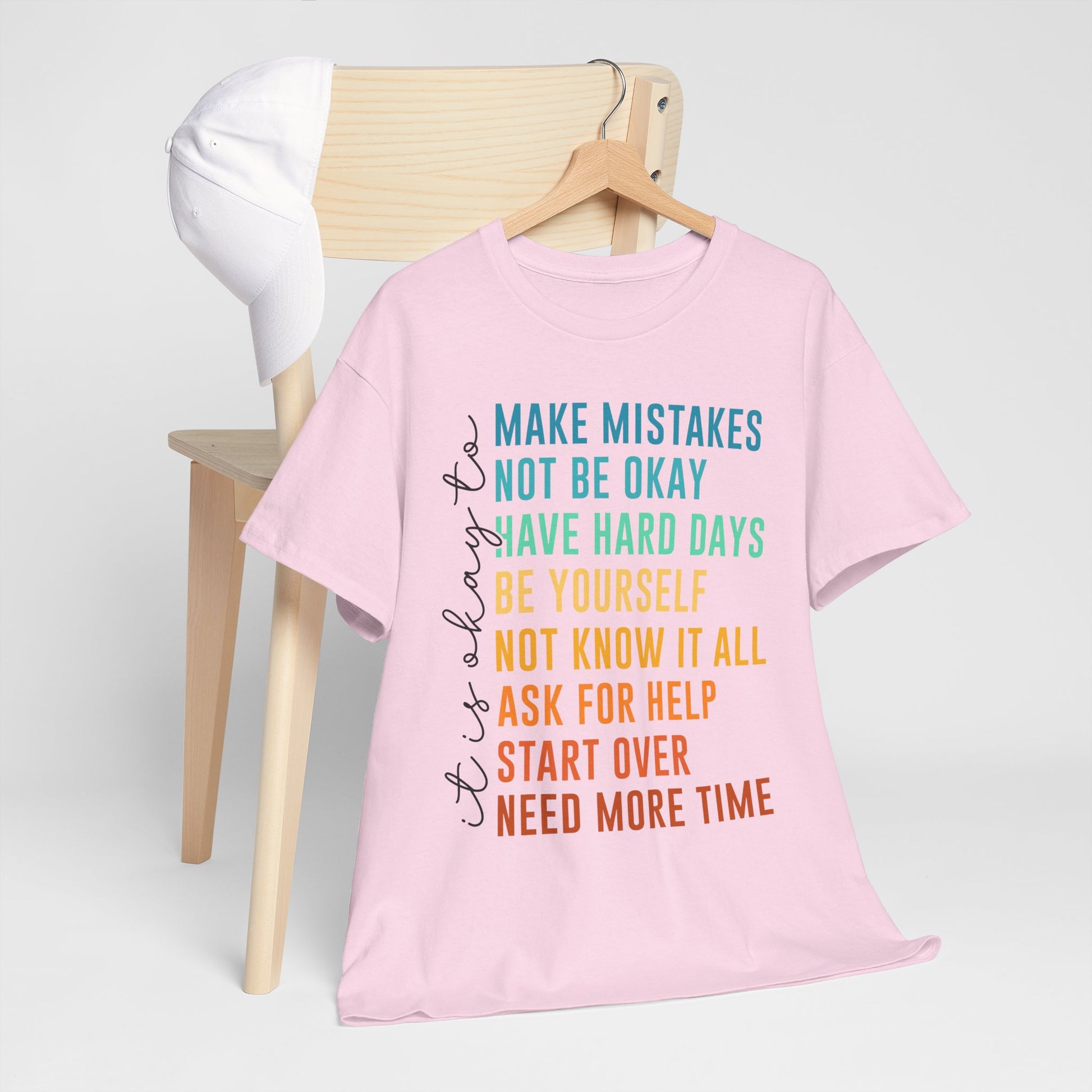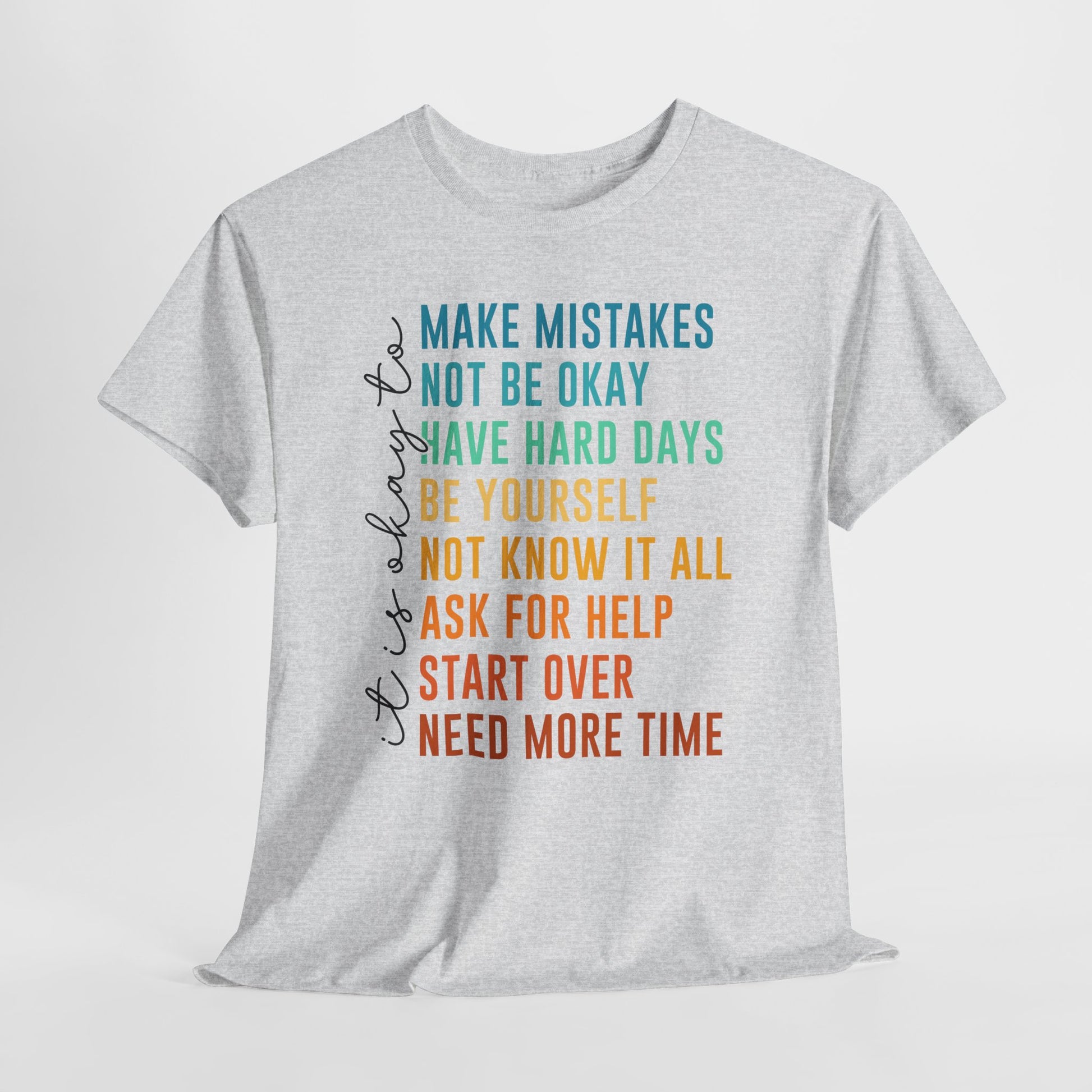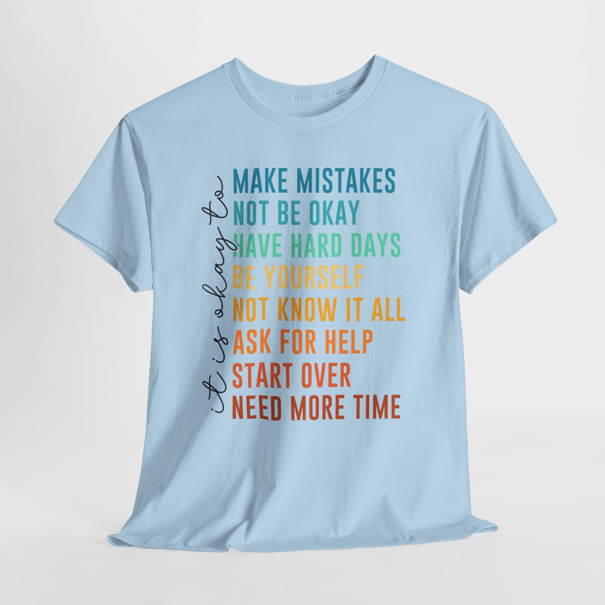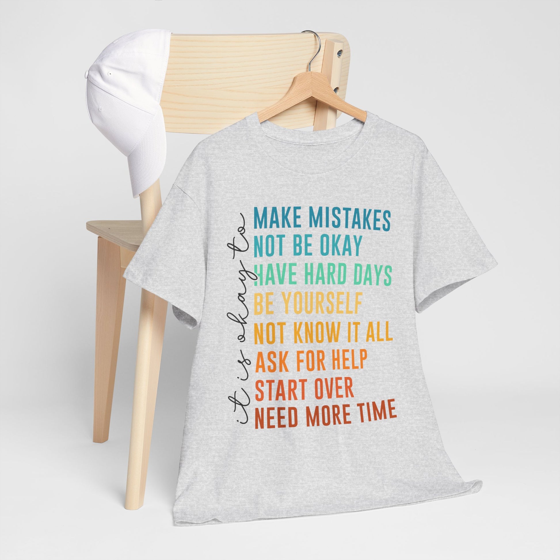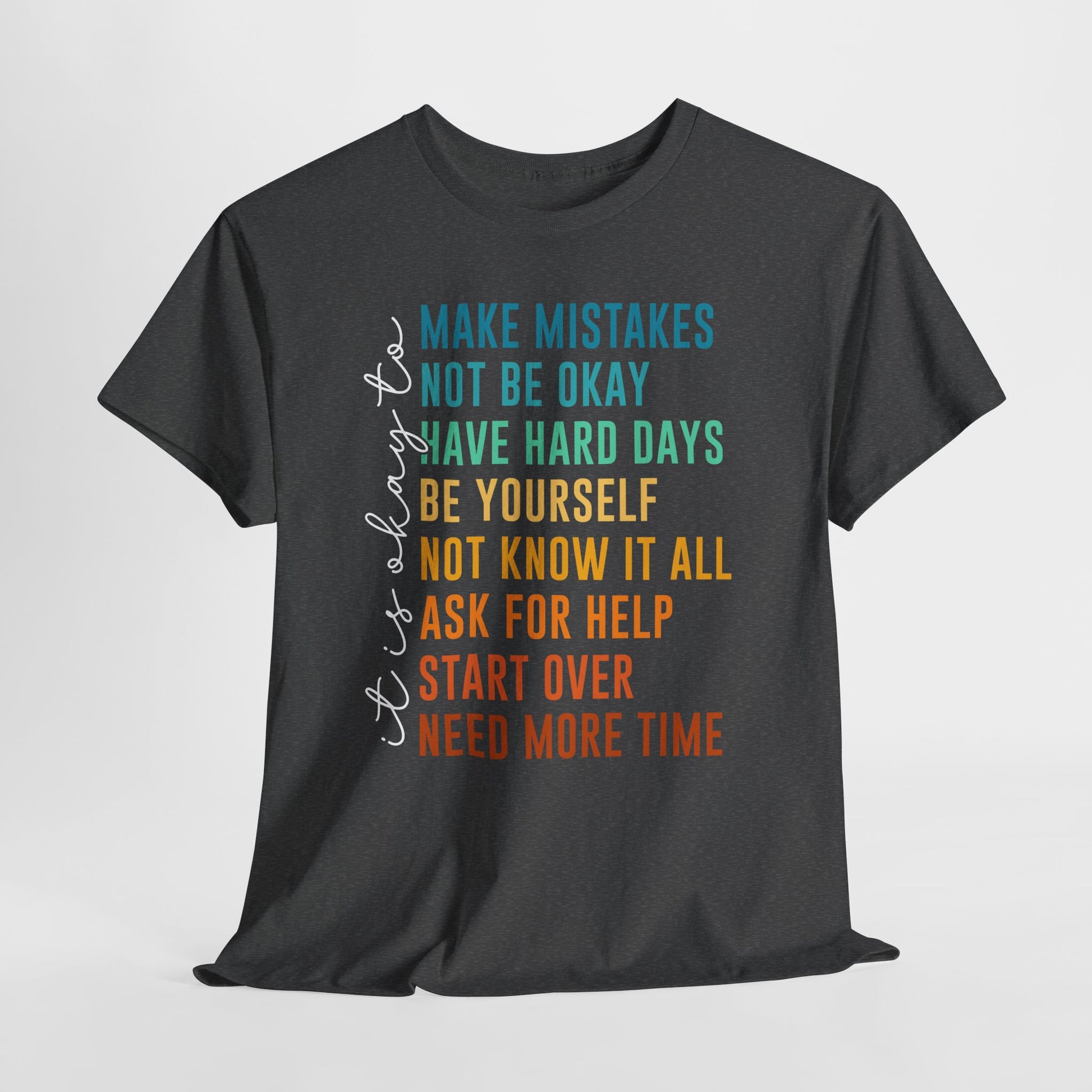 Na nadruku widnieje tekst „it’s okay to” oraz lista krótkich haseł w kolorowym gradiencie: „MAKE MISTAKES”, „NOT BE OKAY”, „HAVE HARD DAYS”, „BE YOURSELF”, „NOT KNOW IT ALL”, „ASK FOR HELP”, „START OVER”, „NEED MORE TIME”. Ten układ wygląda jak prosta mantra - bez kazania, za to z czułością. Smaczek: takie „pozwolenia” to często najlepszy reset - bo zamiast cisnąć, przypominają o człowieczeństwie. To idealny wybór na okres, gdy potrzebujesz wsparcia albo chcesz je dać komuś bliskiemu.