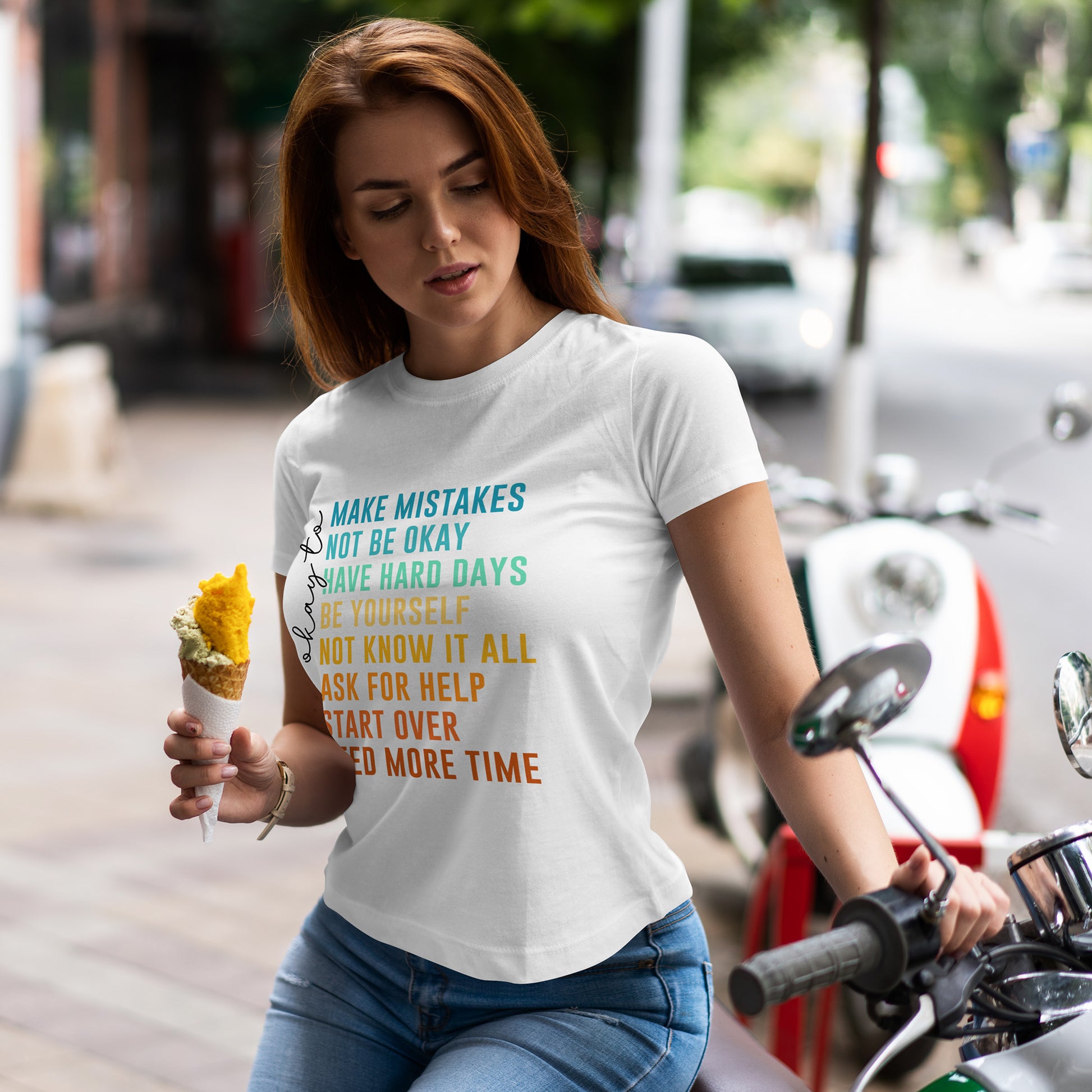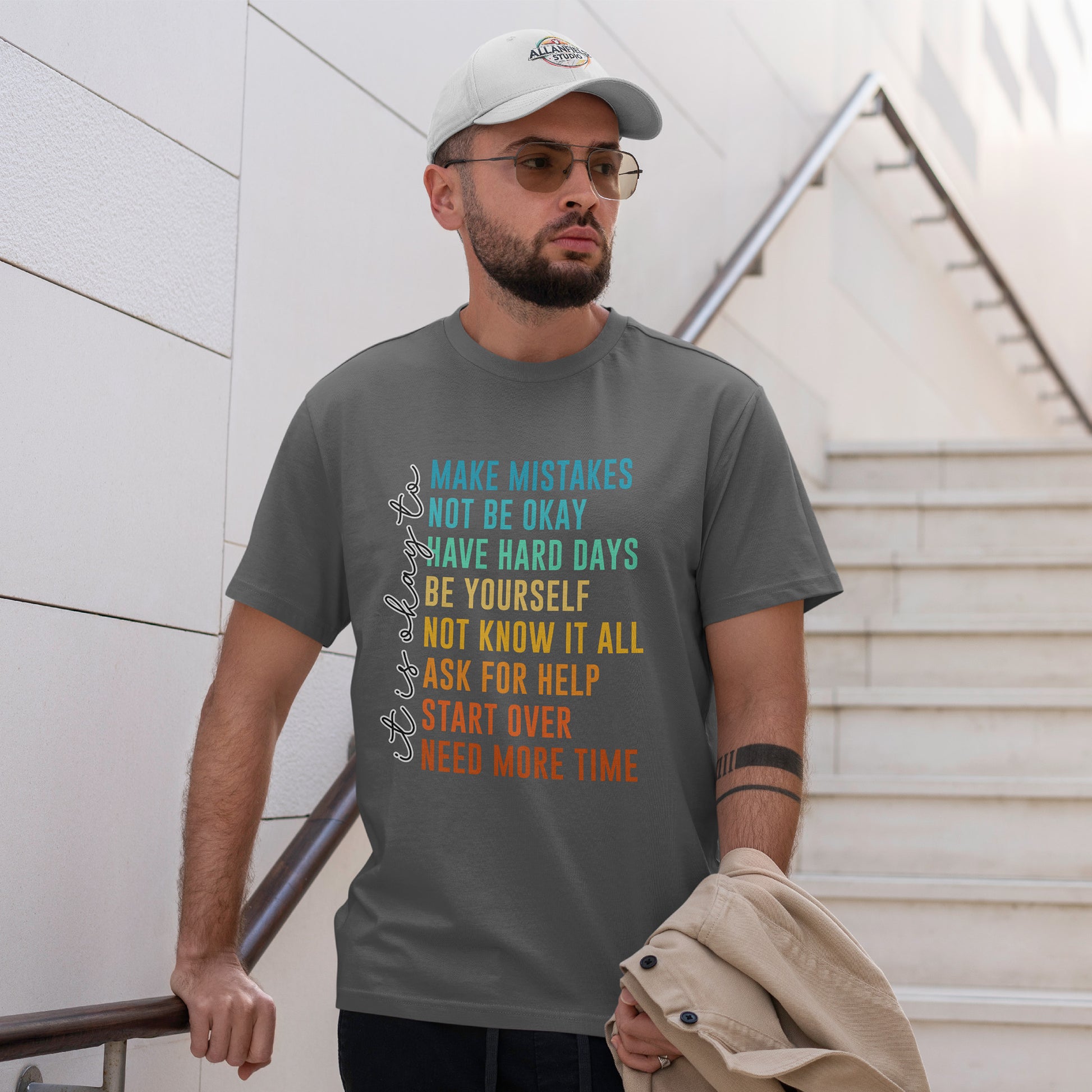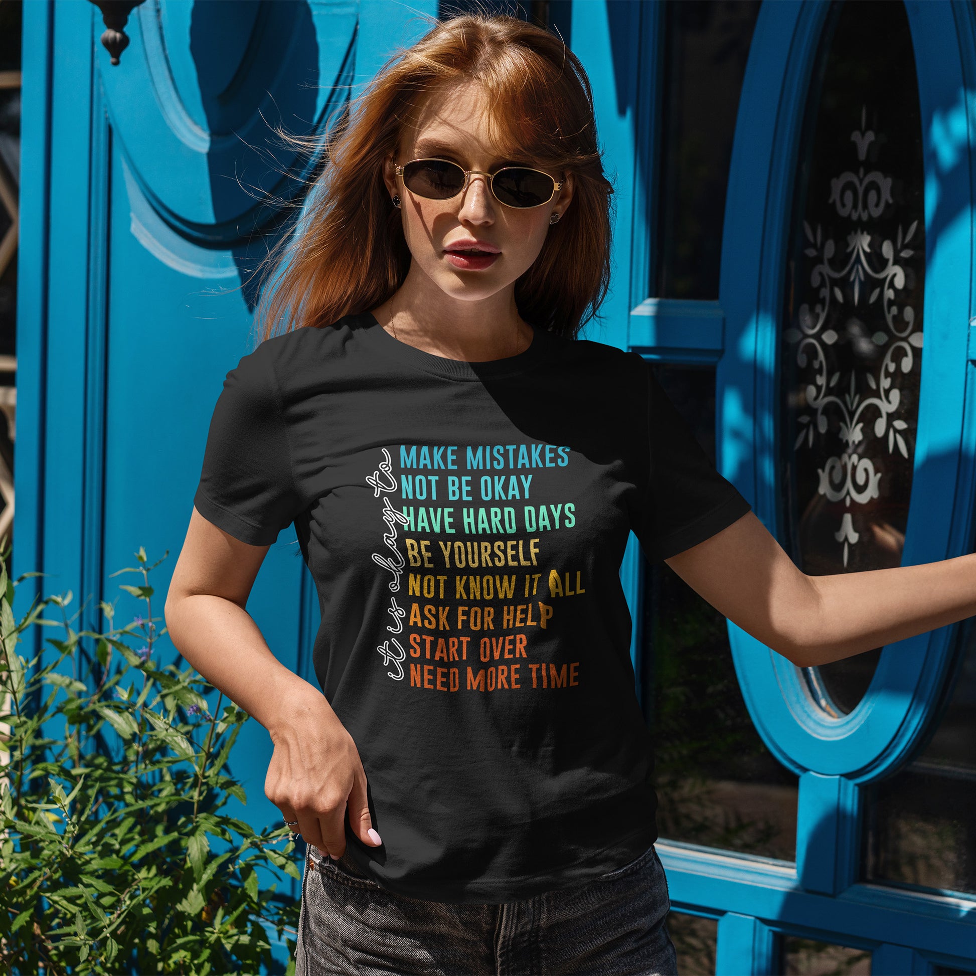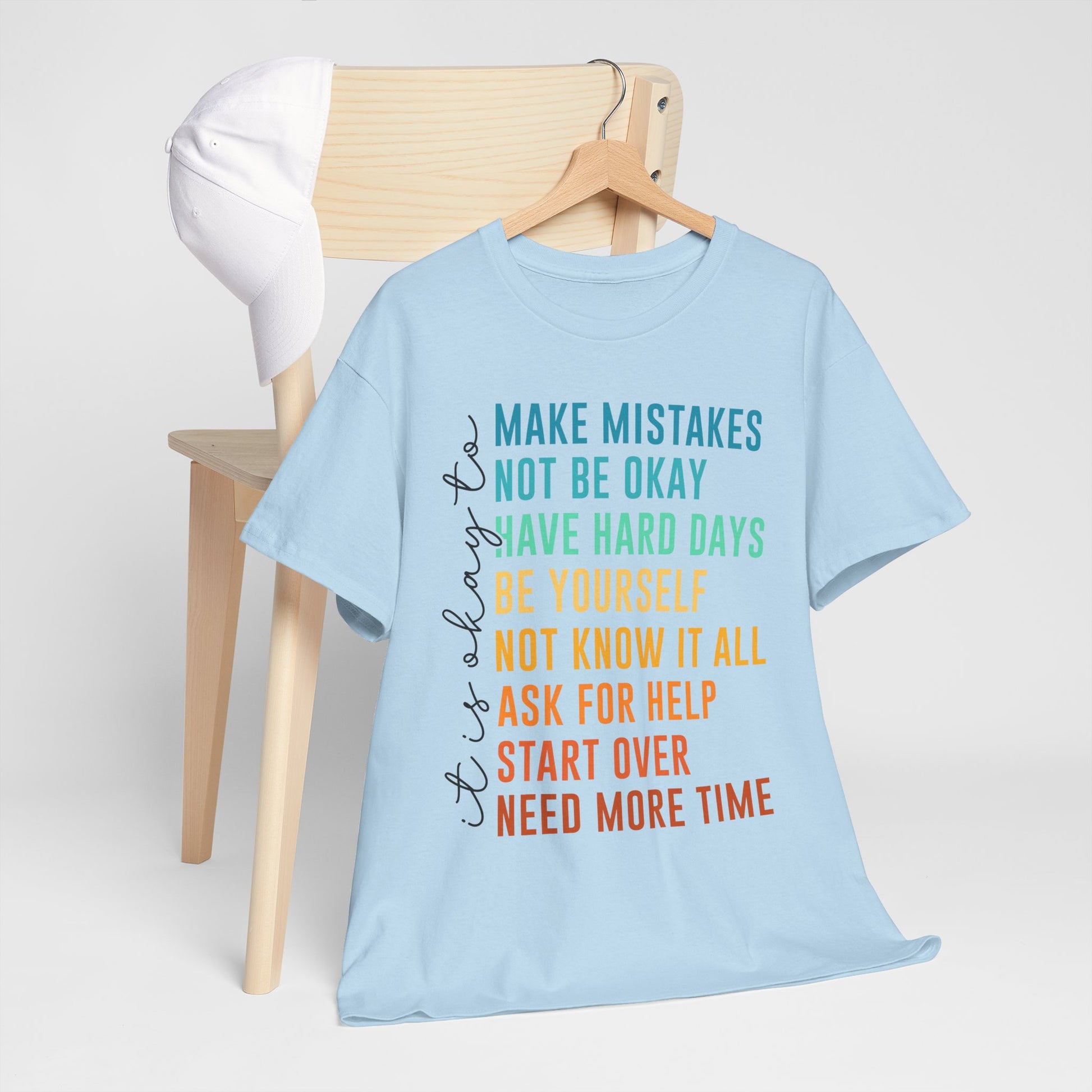 Na nadruku widnieje tekst „it’s okay to” oraz lista krótkich haseł w kolorowym gradiencie: „MAKE MISTAKES”, „NOT BE OKAY”, „HAVE HARD DAYS”, „BE YOURSELF”, „NOT KNOW IT ALL”, „ASK FOR HELP”, „START OVER”, „NEED MORE TIME”. Ten układ wygląda jak prosta mantra - bez kazania, za to z czułością. Smaczek: takie „pozwolenia” to często najlepszy reset - bo zamiast cisnąć, przypominają o człowieczeństwie. To idealny wybór na okres, gdy potrzebujesz wsparcia albo chcesz je dać komuś bliskiemu.