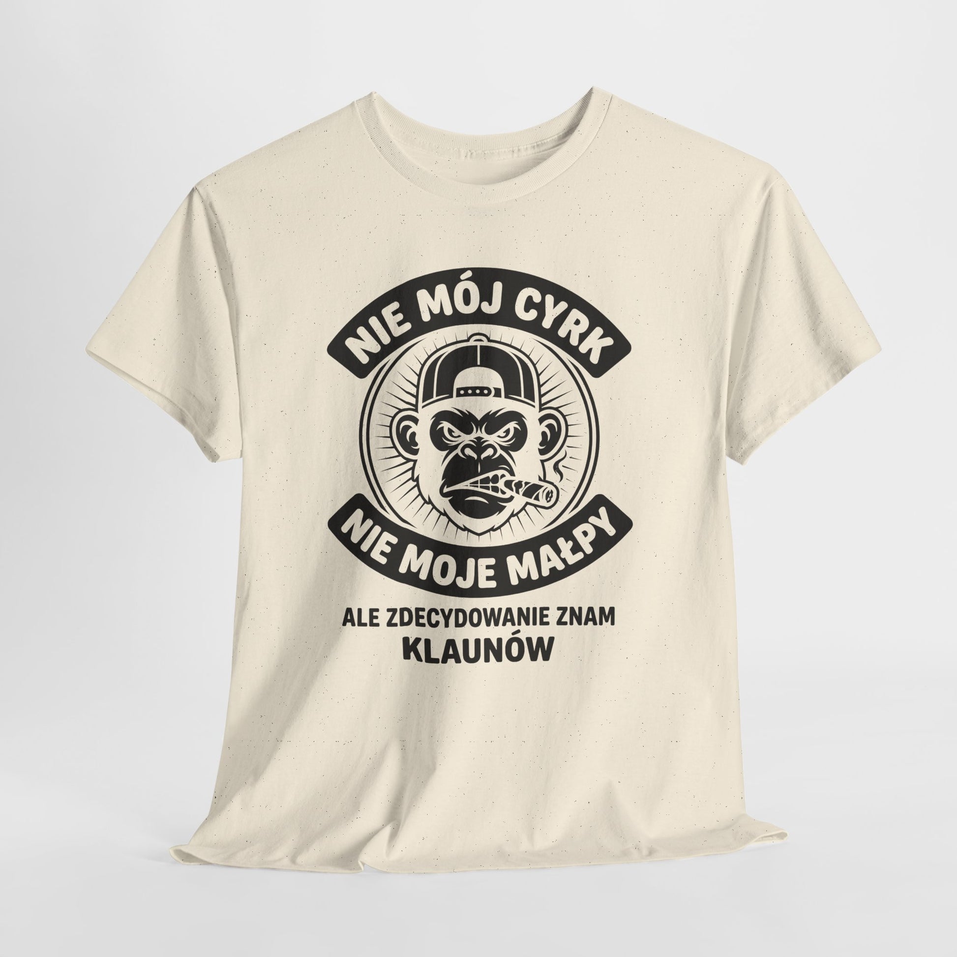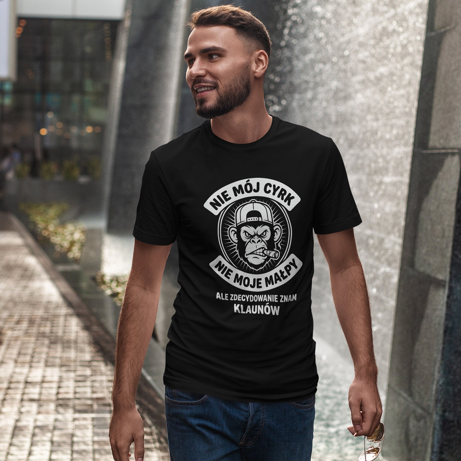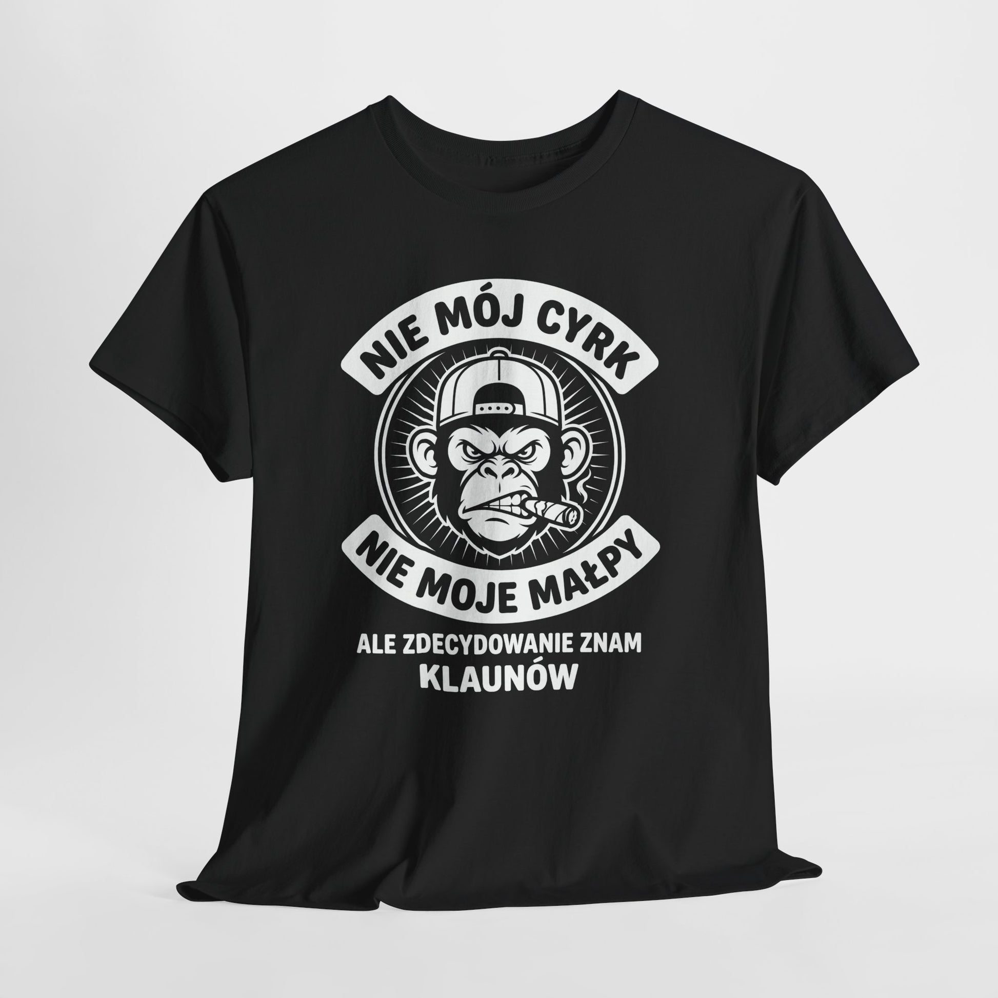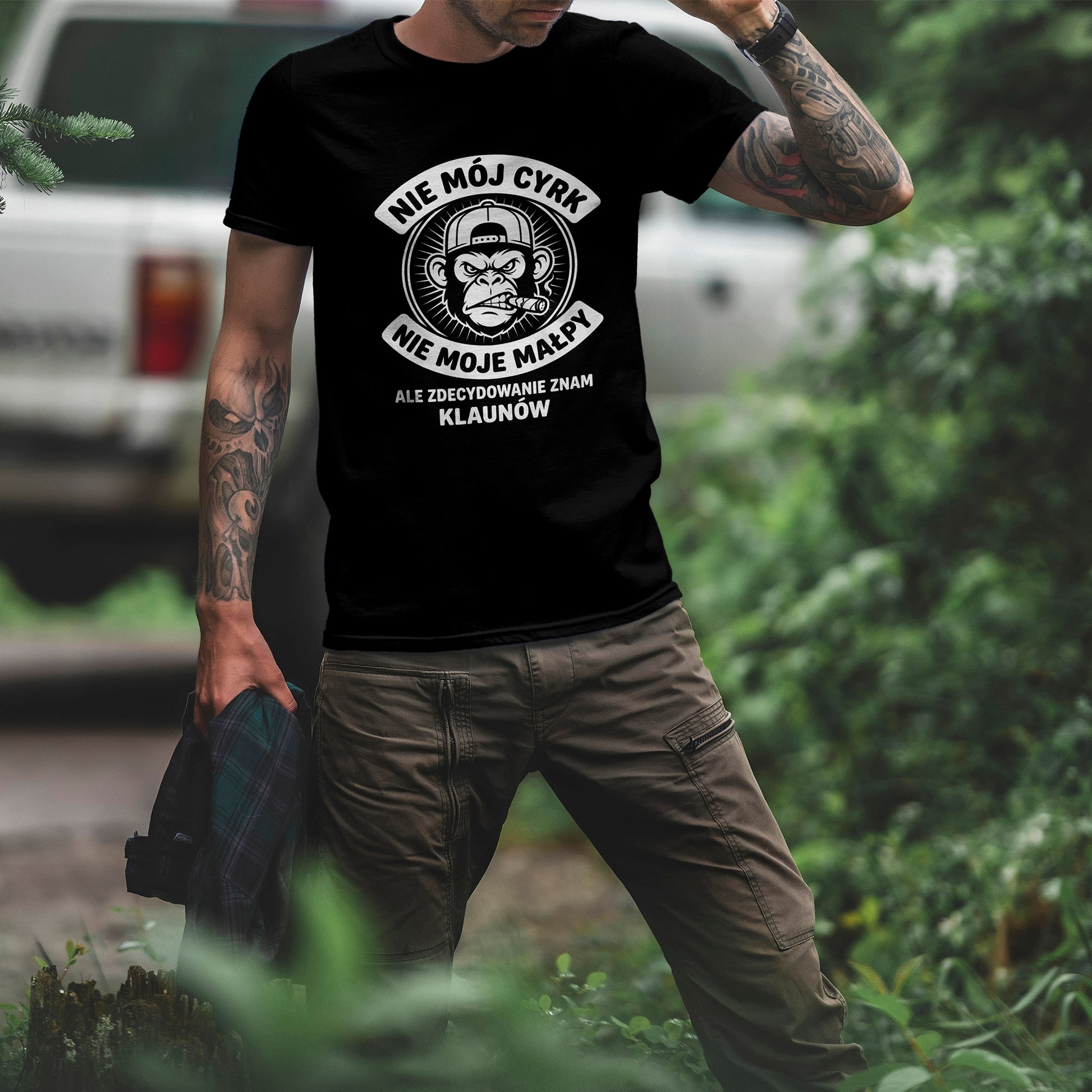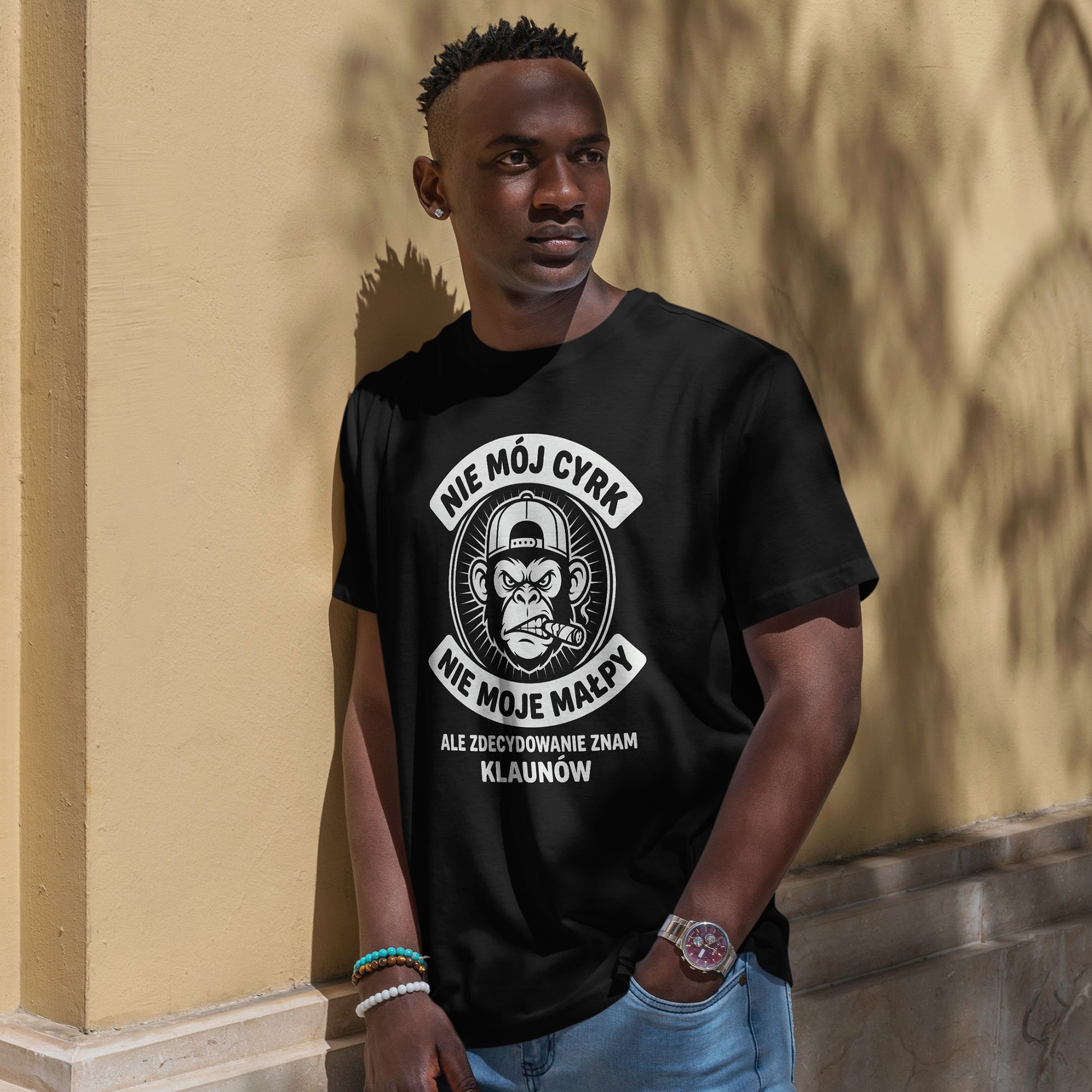 Na nadruku jest dokładny tekst: „NIE MÓJ CYRK NIE MOJE MAŁPY ALE ZDECYDOWANIE ZNAM KLAUNÓW”. Do tego stylowa, czarno-biała grafika: wkurzona małpa w czapce z cygarem, w okrągłym emblemacie jak odznaka. Smaczek: to powiedzonko w punkt łapie moment, kiedy nie jesteś odpowiedzialny za chaos, ale doskonale wiesz, kto go robi. To koszulka, która działa jak szybka riposta - bez gadania, bez tłumaczeń.