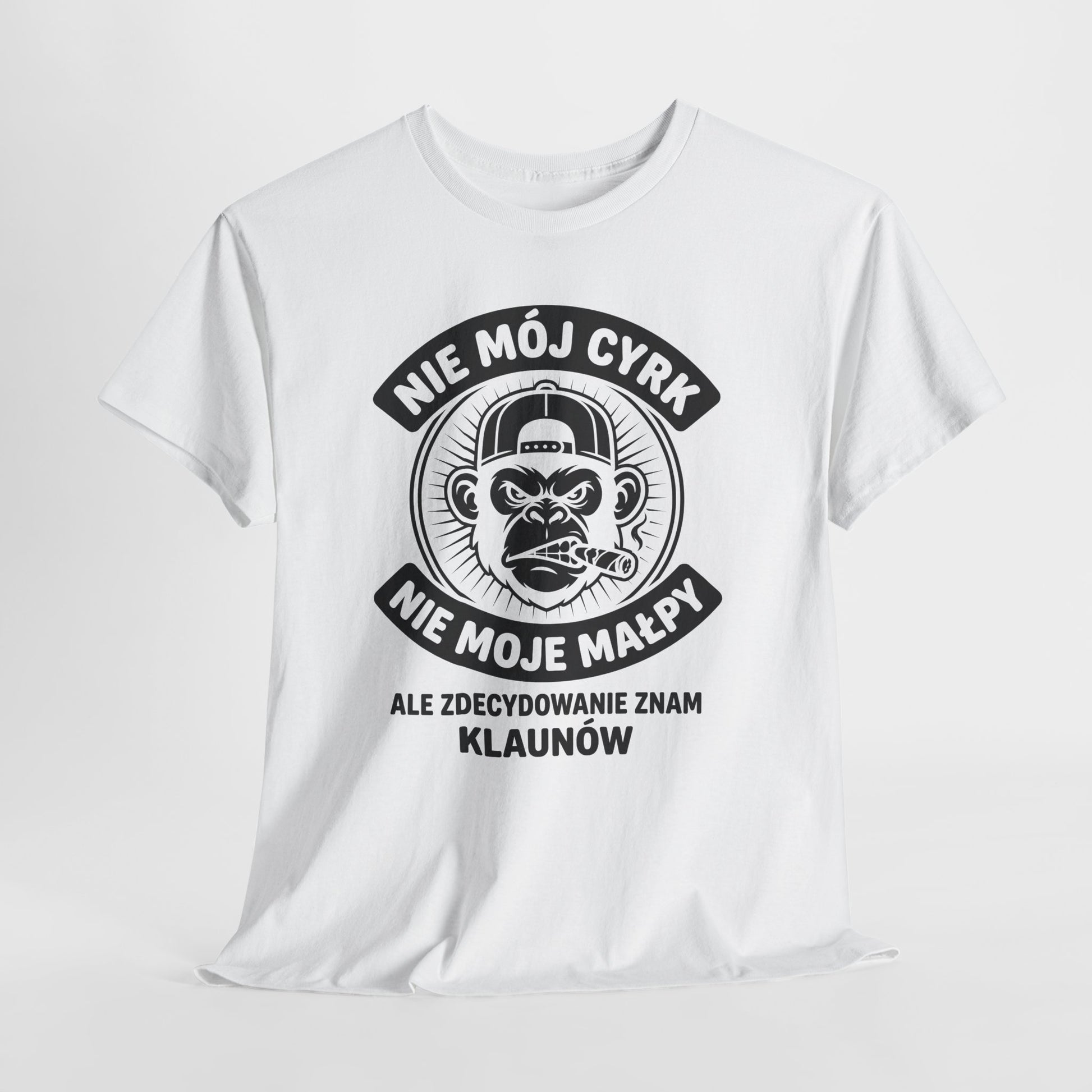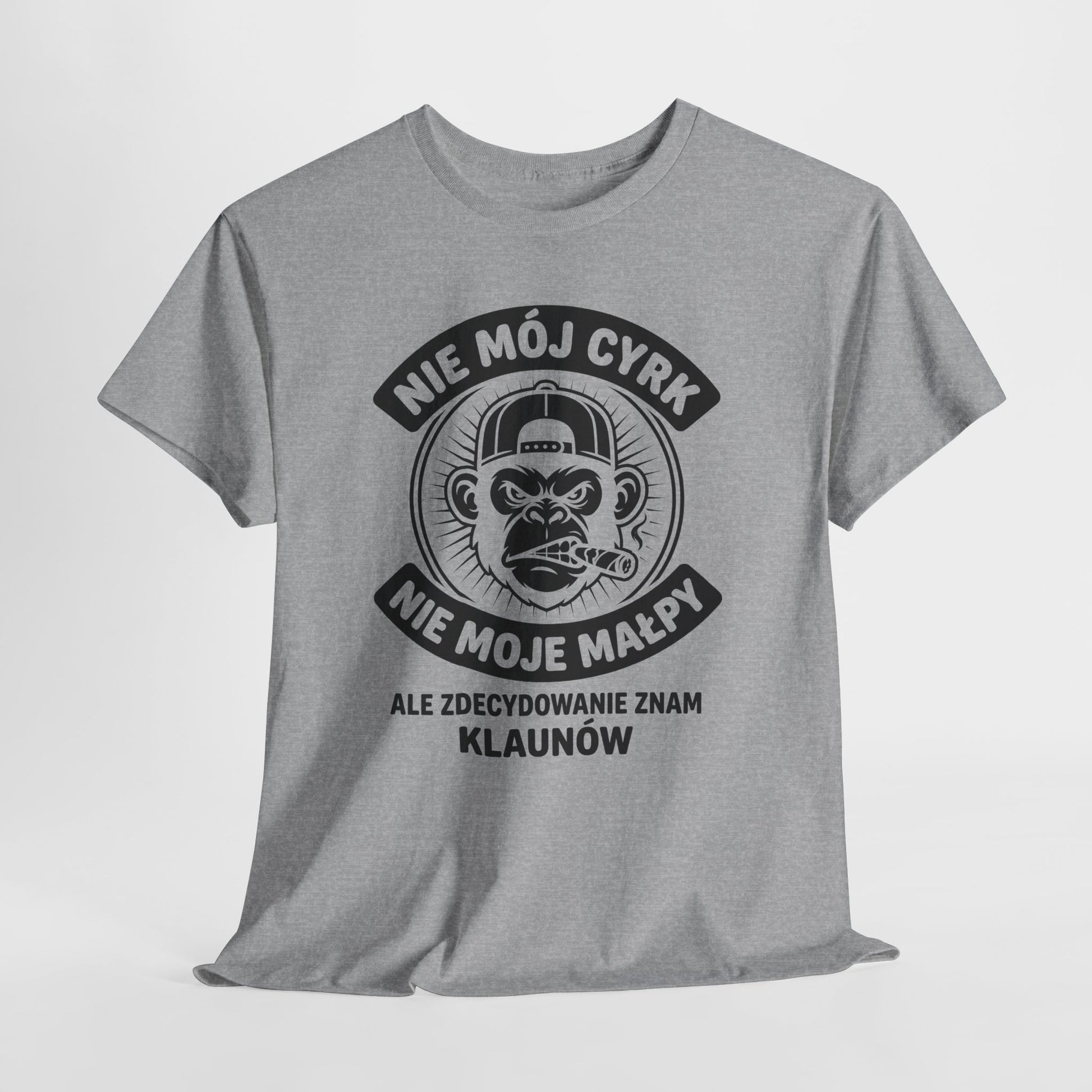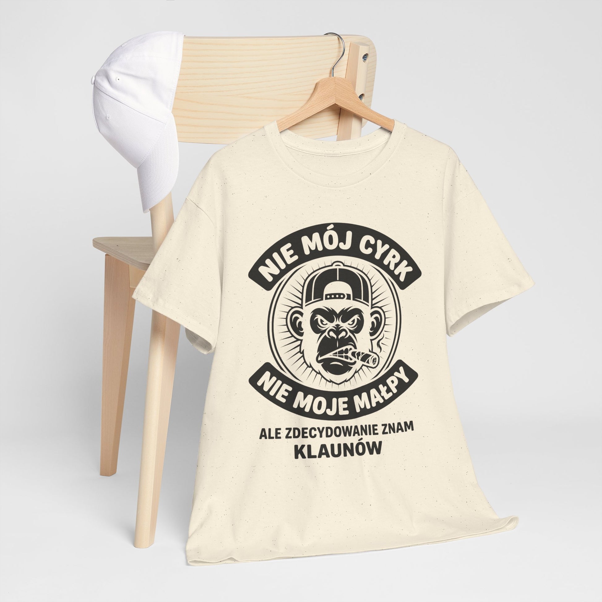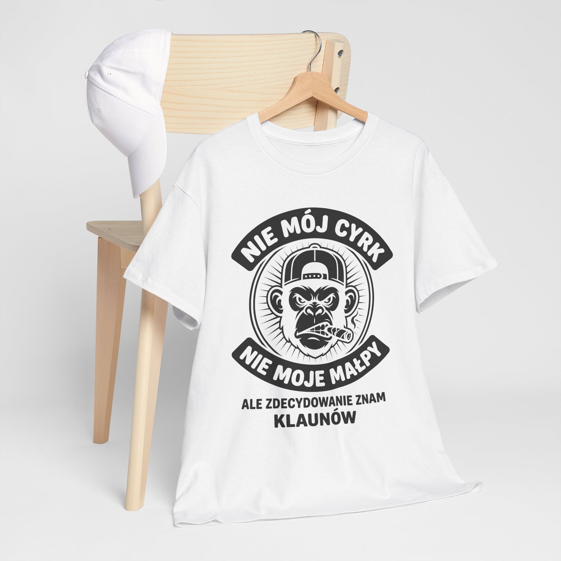 Na nadruku jest dokładny tekst: „NIE MÓJ CYRK NIE MOJE MAŁPY ALE ZDECYDOWANIE ZNAM KLAUNÓW”. Do tego stylowa, czarno-biała grafika: wkurzona małpa w czapce z cygarem, w okrągłym emblemacie jak odznaka. Smaczek: to powiedzonko w punkt łapie moment, kiedy nie jesteś odpowiedzialny za chaos, ale doskonale wiesz, kto go robi. To koszulka, która działa jak szybka riposta - bez gadania, bez tłumaczeń.