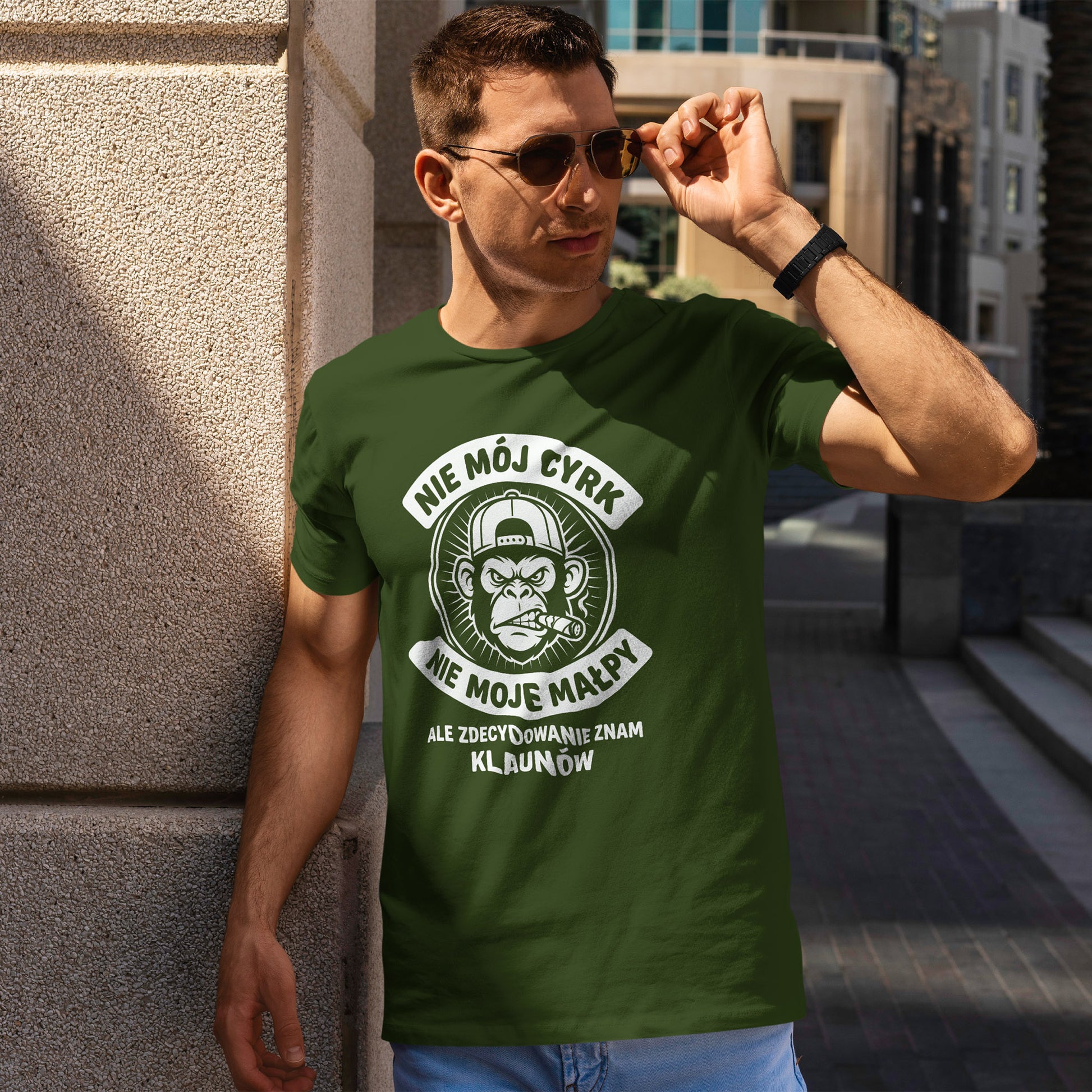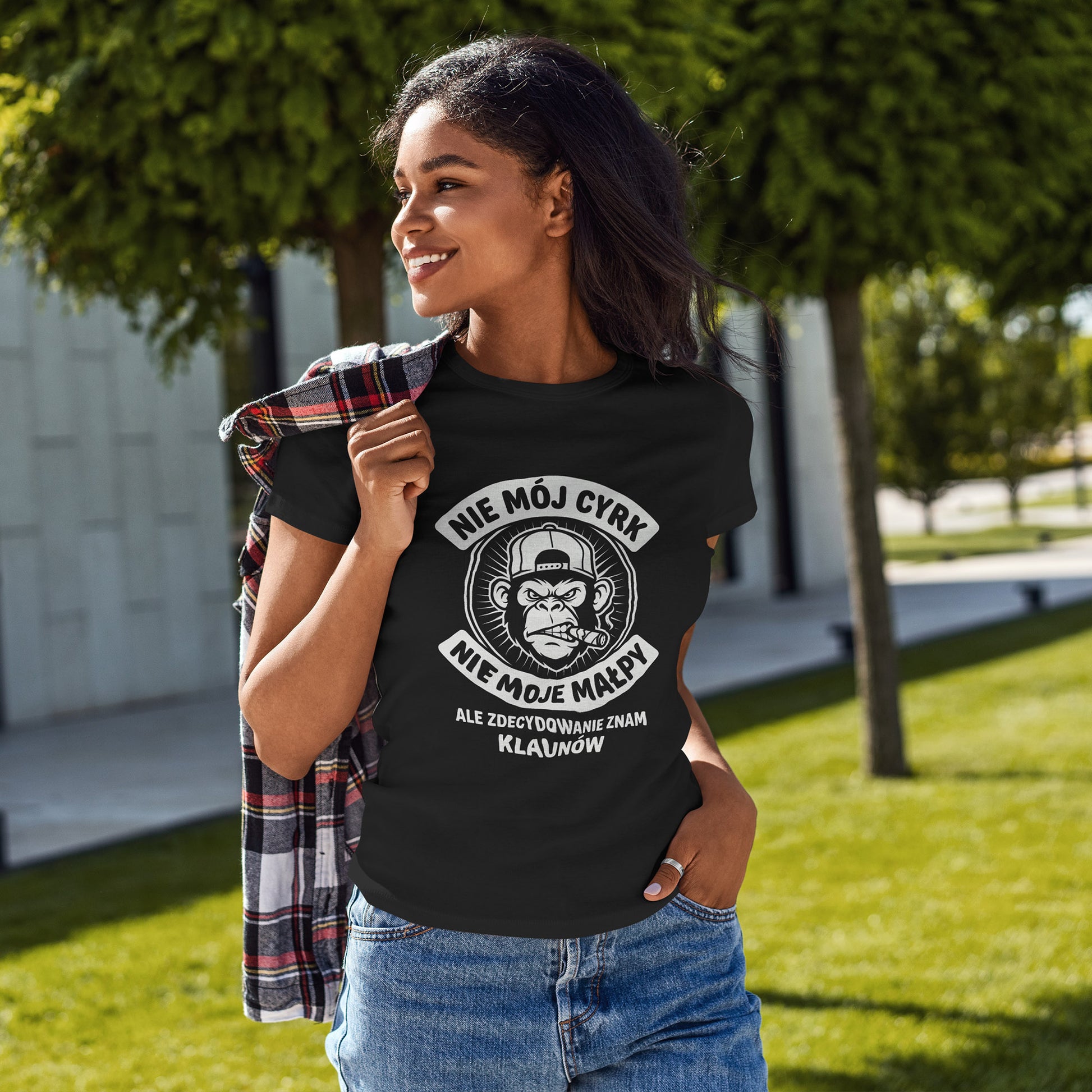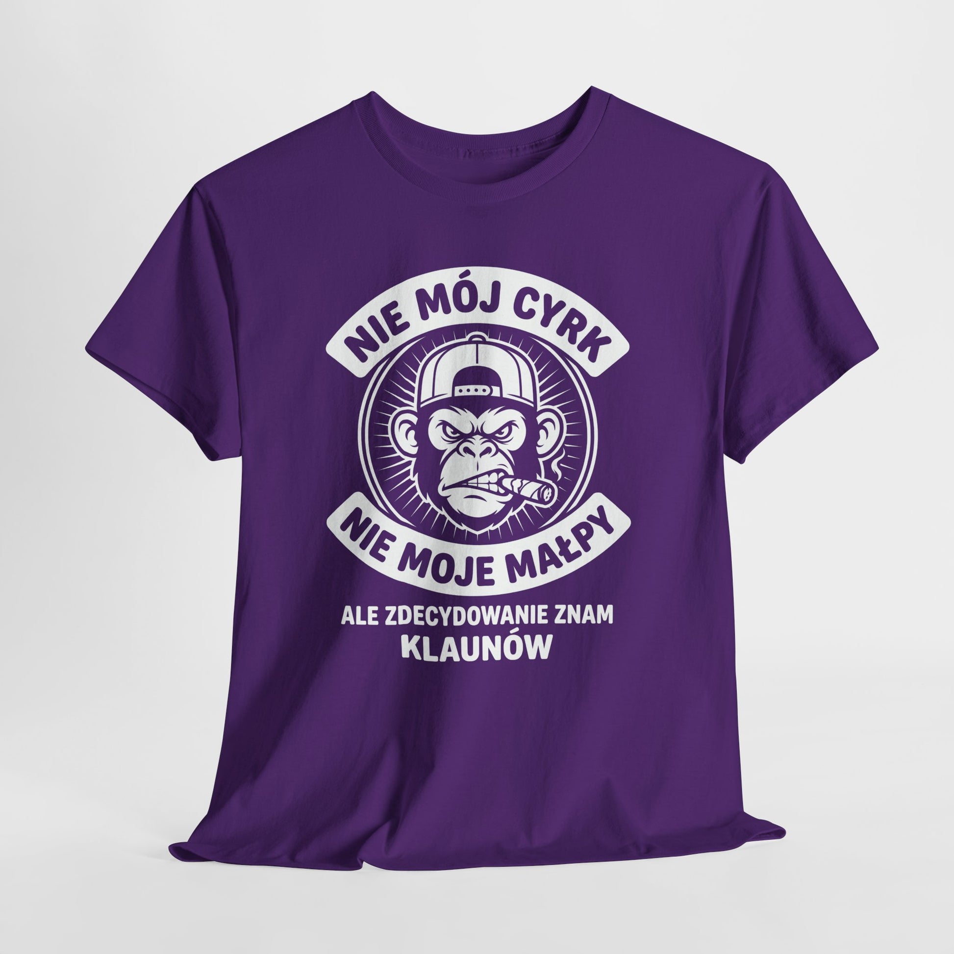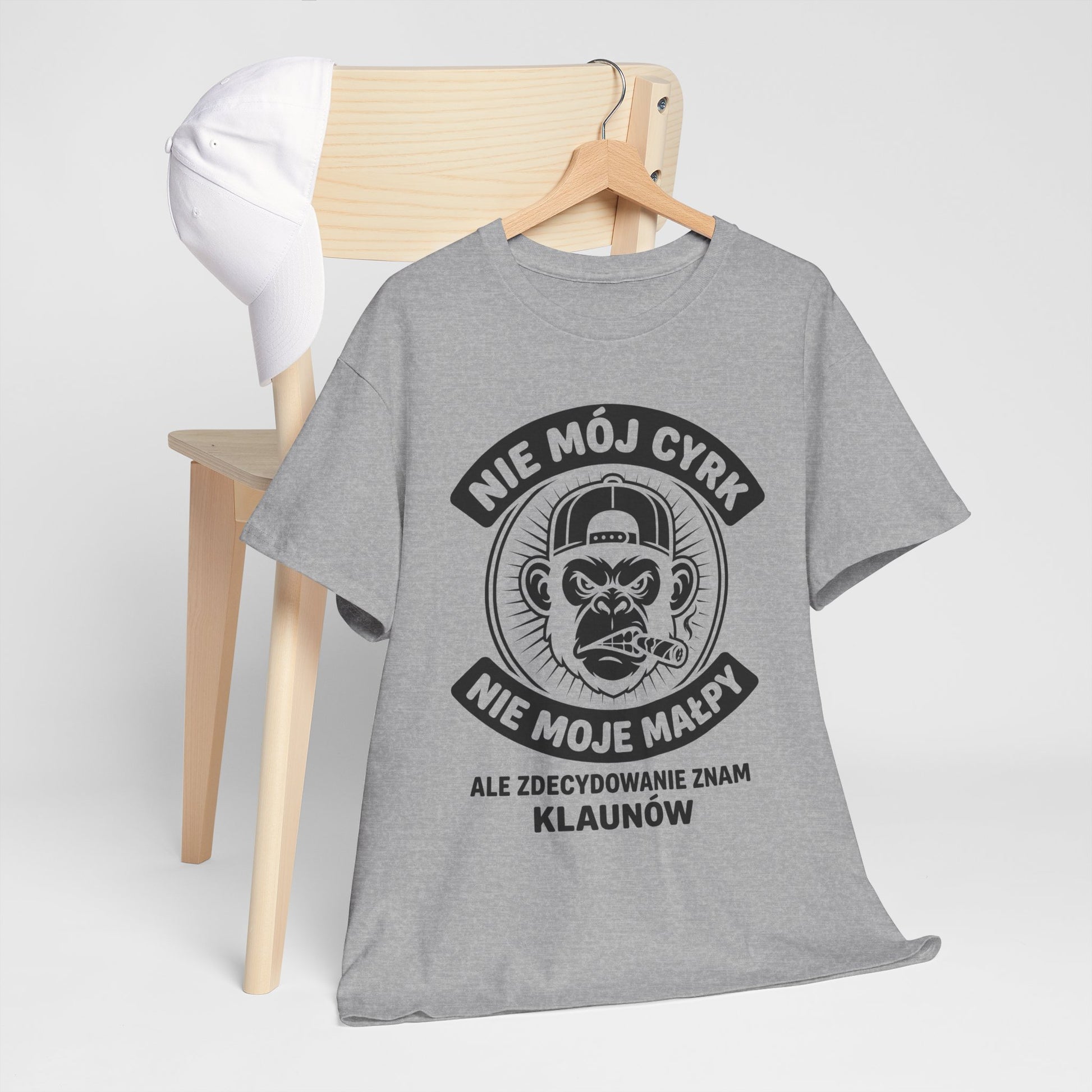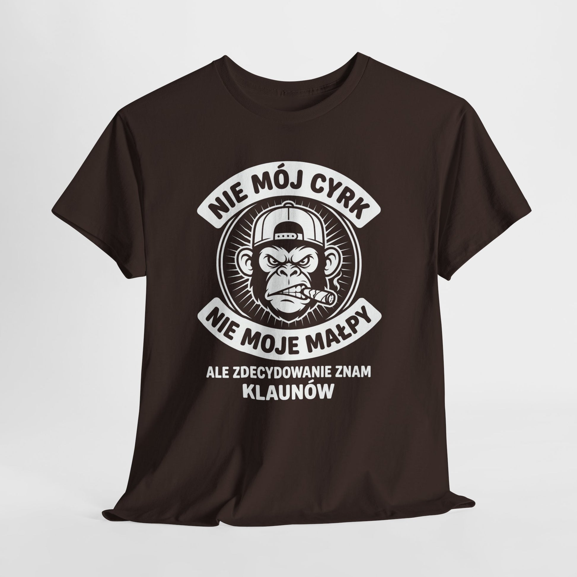 Na nadruku jest dokładny tekst: „NIE MÓJ CYRK NIE MOJE MAŁPY ALE ZDECYDOWANIE ZNAM KLAUNÓW”. Do tego stylowa, czarno-biała grafika: wkurzona małpa w czapce z cygarem, w okrągłym emblemacie jak odznaka. Smaczek: to powiedzonko w punkt łapie moment, kiedy nie jesteś odpowiedzialny za chaos, ale doskonale wiesz, kto go robi. To koszulka, która działa jak szybka riposta - bez gadania, bez tłumaczeń.