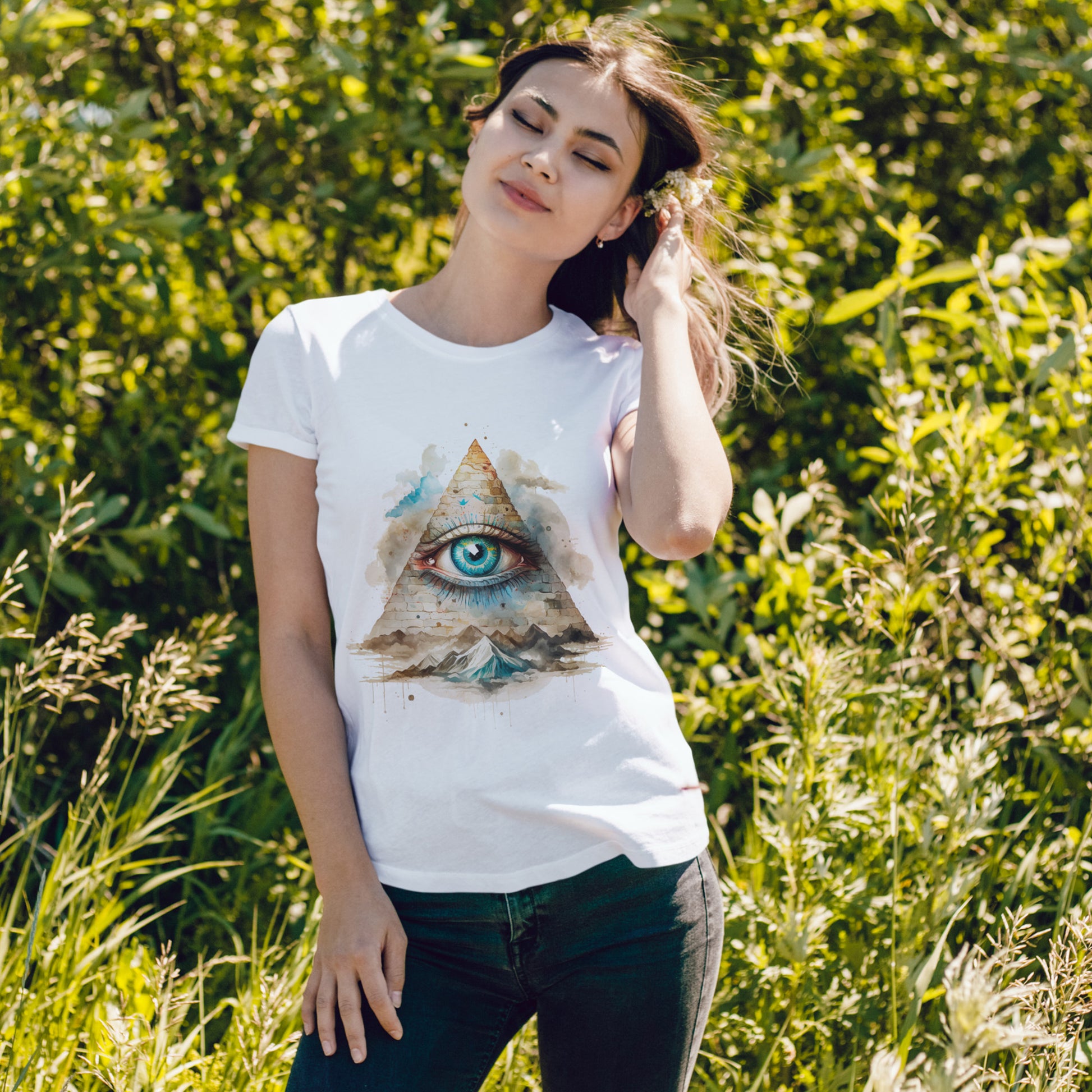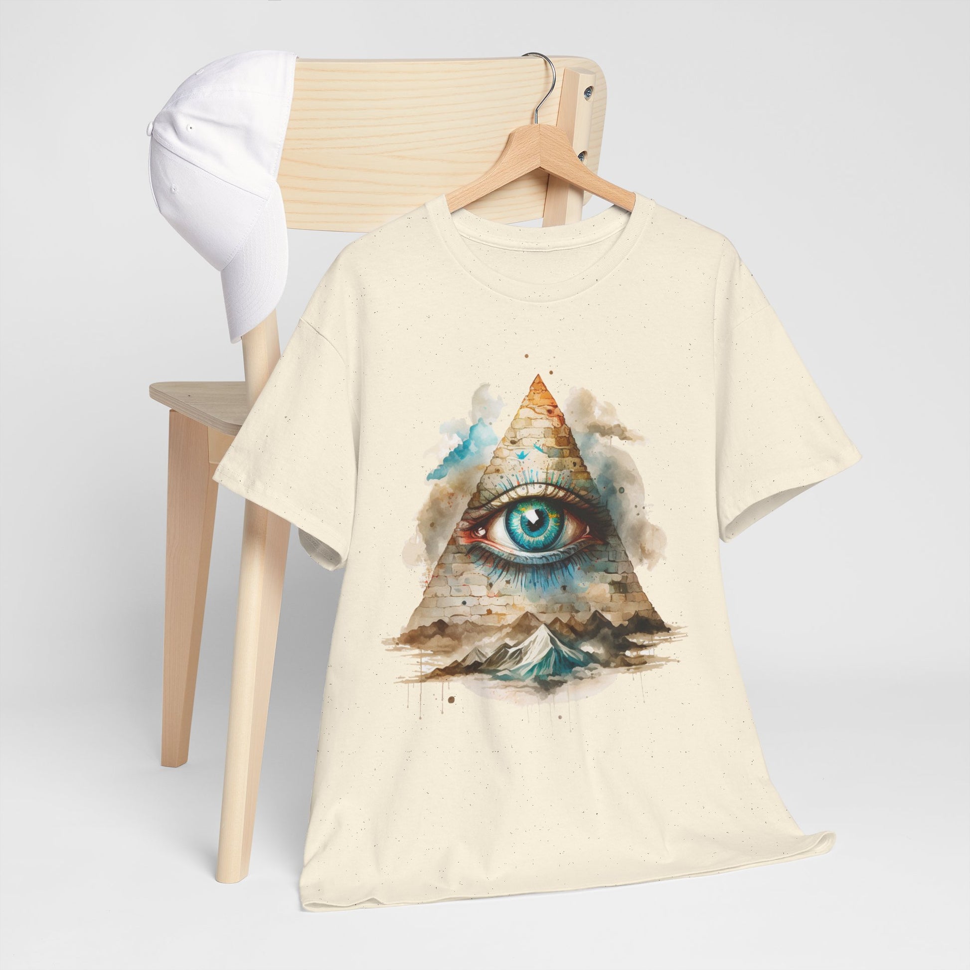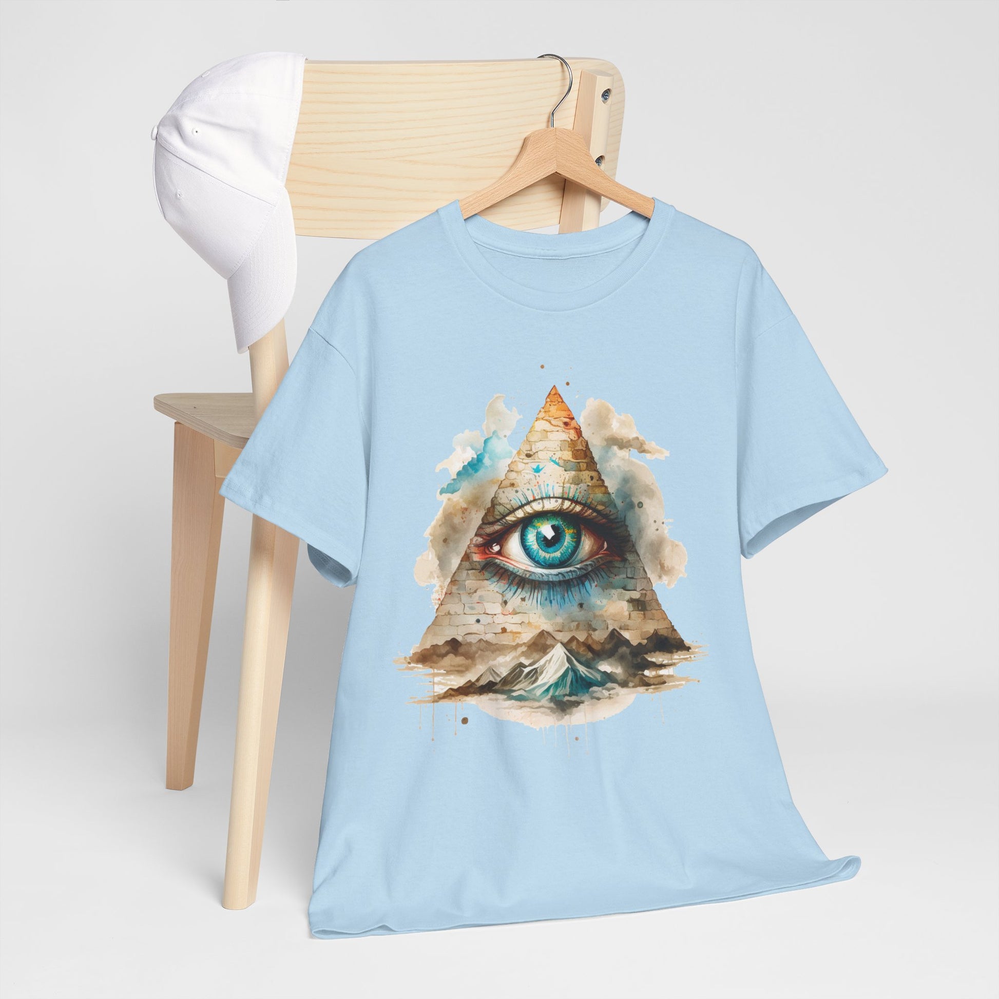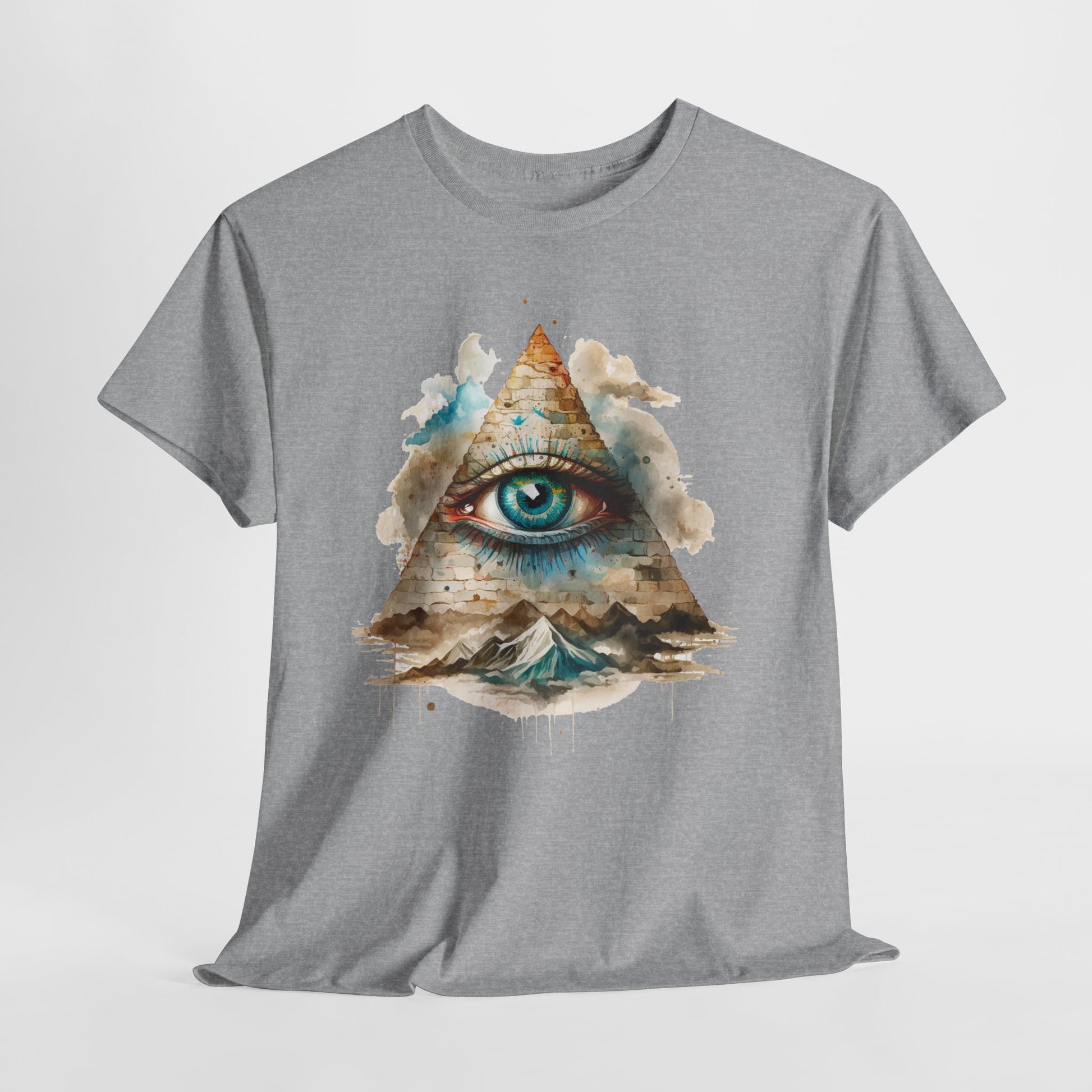 Na grafice widać trójkątną piramidę z wielkim, niebieskim okiem — symbol powszechnie kojarzony z Illuminatami i popkulturą teorii spiskowych. Do tego dochodzi faktura „kamiennych” bloczków, akwarelowe chmury i rozlane plamy farby, które dodają całości miękkiego, malarskiego vibe’u. Na dole pojawiają się góry, jakby ten znak wisiał nad światem i spokojnie wszystko obserwował. To projekt, który jednych przyciąga estetyką, a innych od razu odpala w głowie: „okej, to jest TO oko”. Świetnie działa jako centralny punkt stylówki — sam w sobie robi robotę.